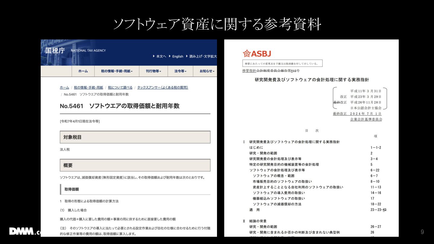 利益が増える → 法人税が増える - 費用化すると:今年の費用が増える → 利益が減る → 法人税が減る 価値 時間 ソフトウェア 仮勘定 開発中 1年 2年 3年 資産計上 → 減価償却 残存価値 価値 時間 ソフトウェア 仮勘定 開発中 1年 2年 3年 費用化(経費) 残存価値 なし 8