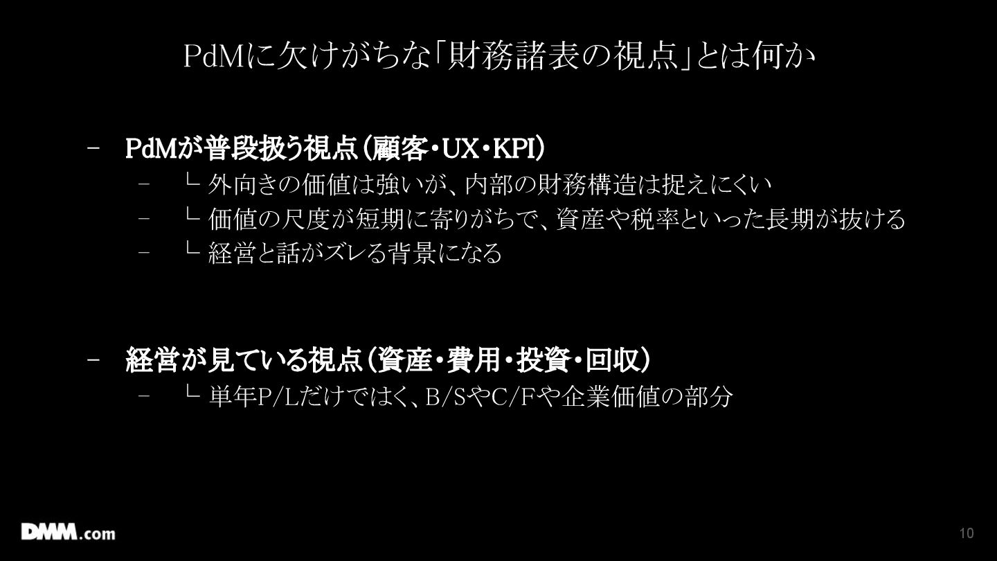 10 PdMに欠けがちな「財務諸表の視点」とは何か - PdMが普段扱う視点(顧客・UX・KPI) - └ 外向きの価値は強いが、内部の財務構造は捉えにくい - └