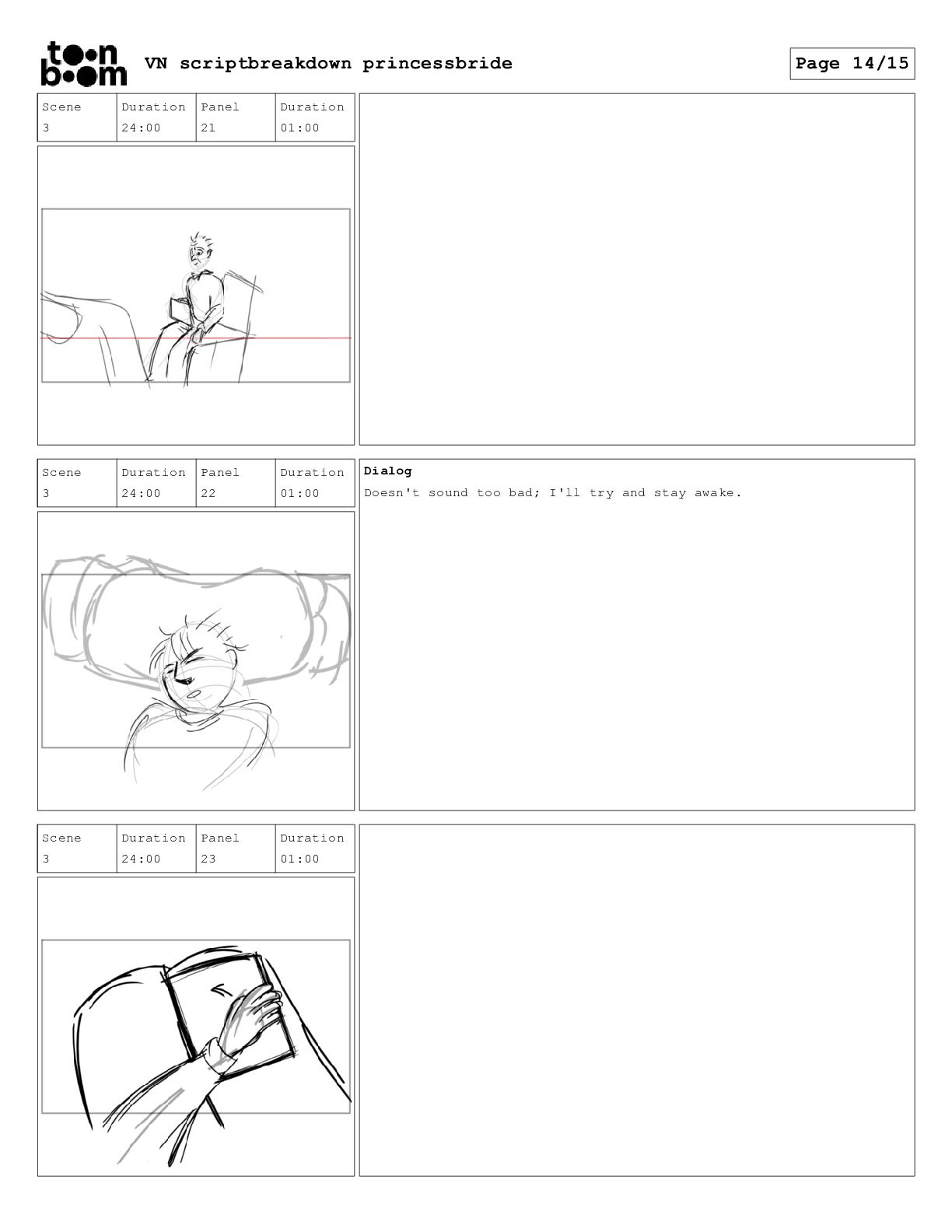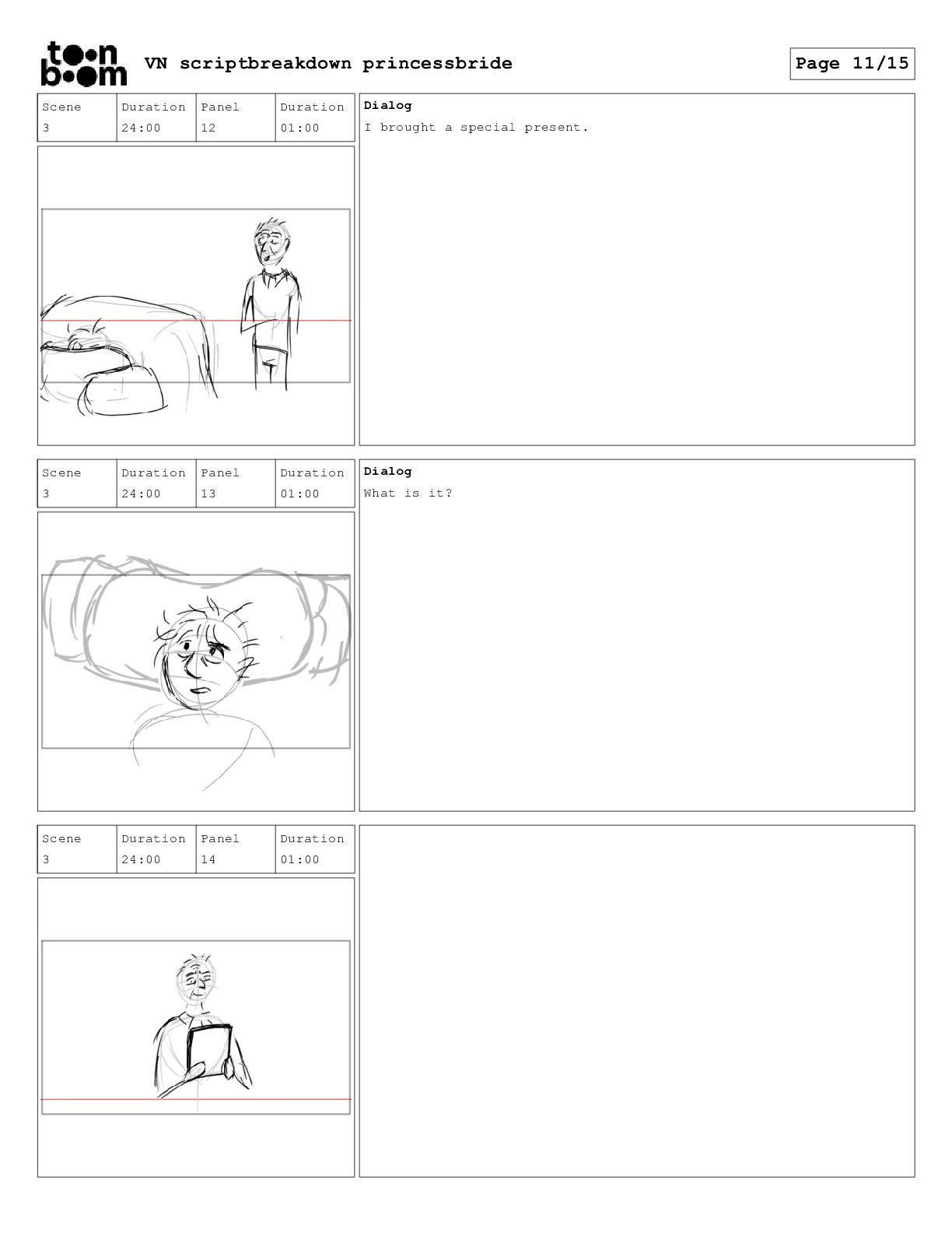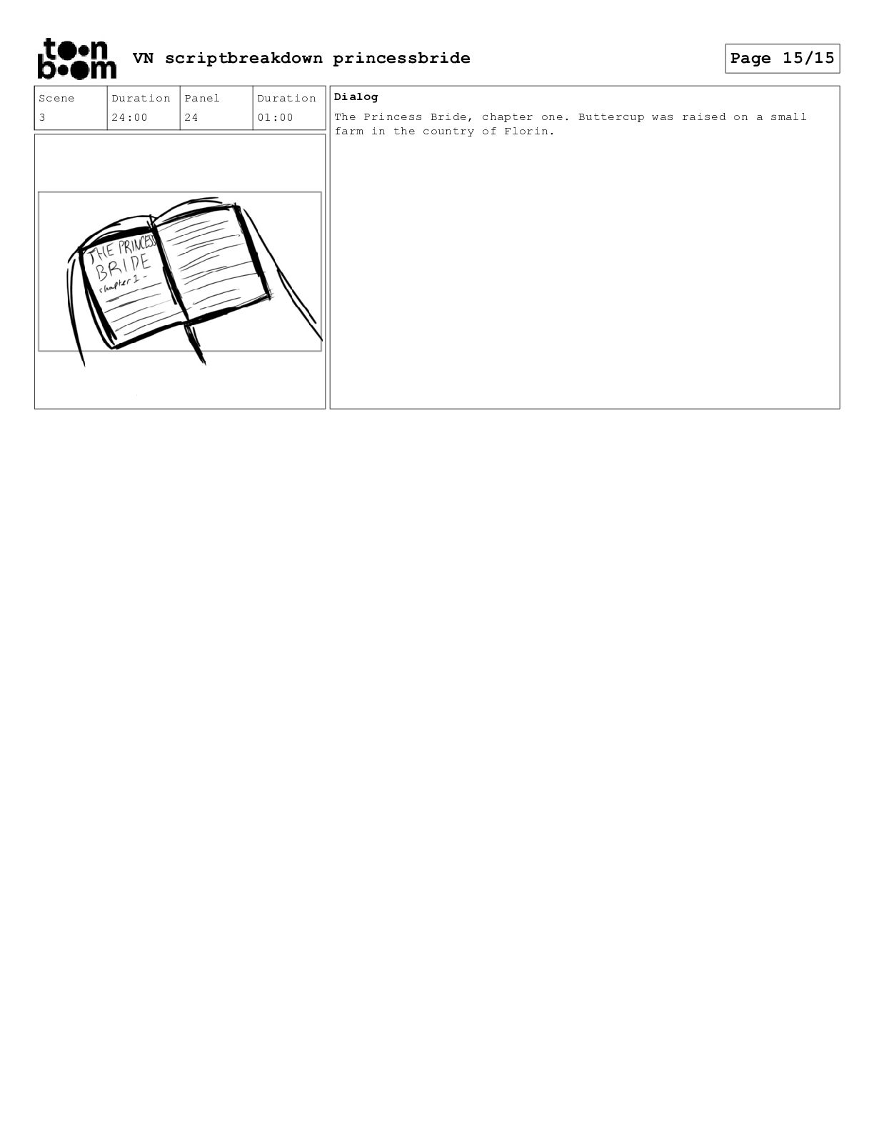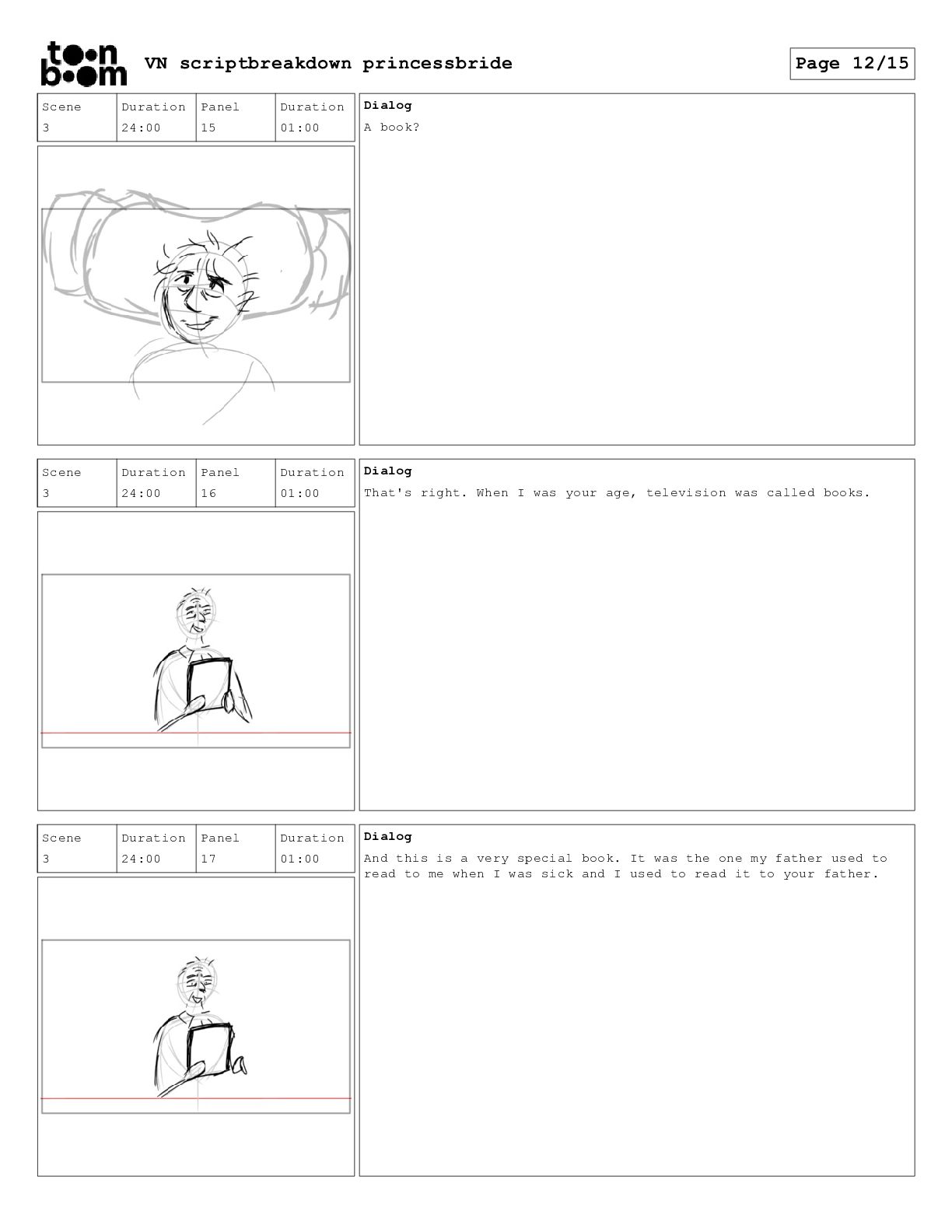 book? Scene 3 Duration 24:00 Panel 16 Duration 01:00 Dialog That's right. When I was your age, television was called books. Scene 3 Duration 24:00 Panel 17 Duration 01:00 Dialog And this is a very special book. It was the one my father used to read to me when I was sick and I used to read it to your father. VN scriptbreakdown princessbride Page 12/15