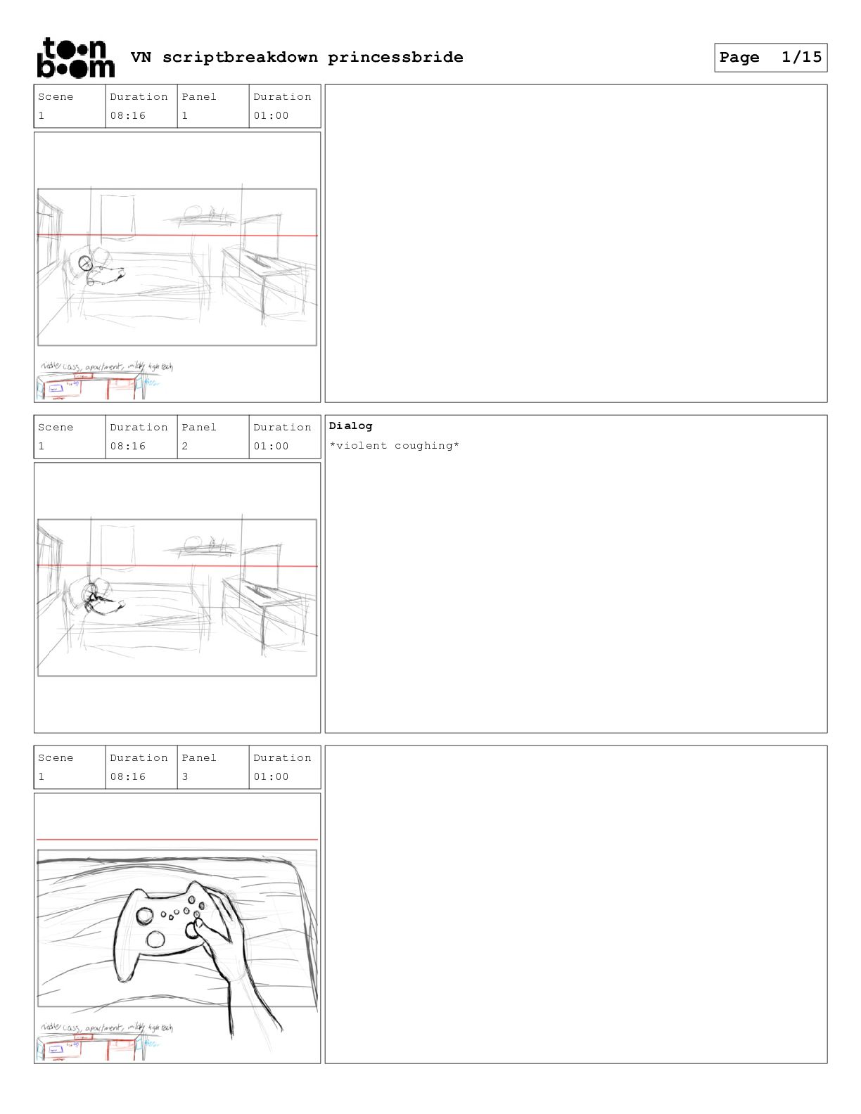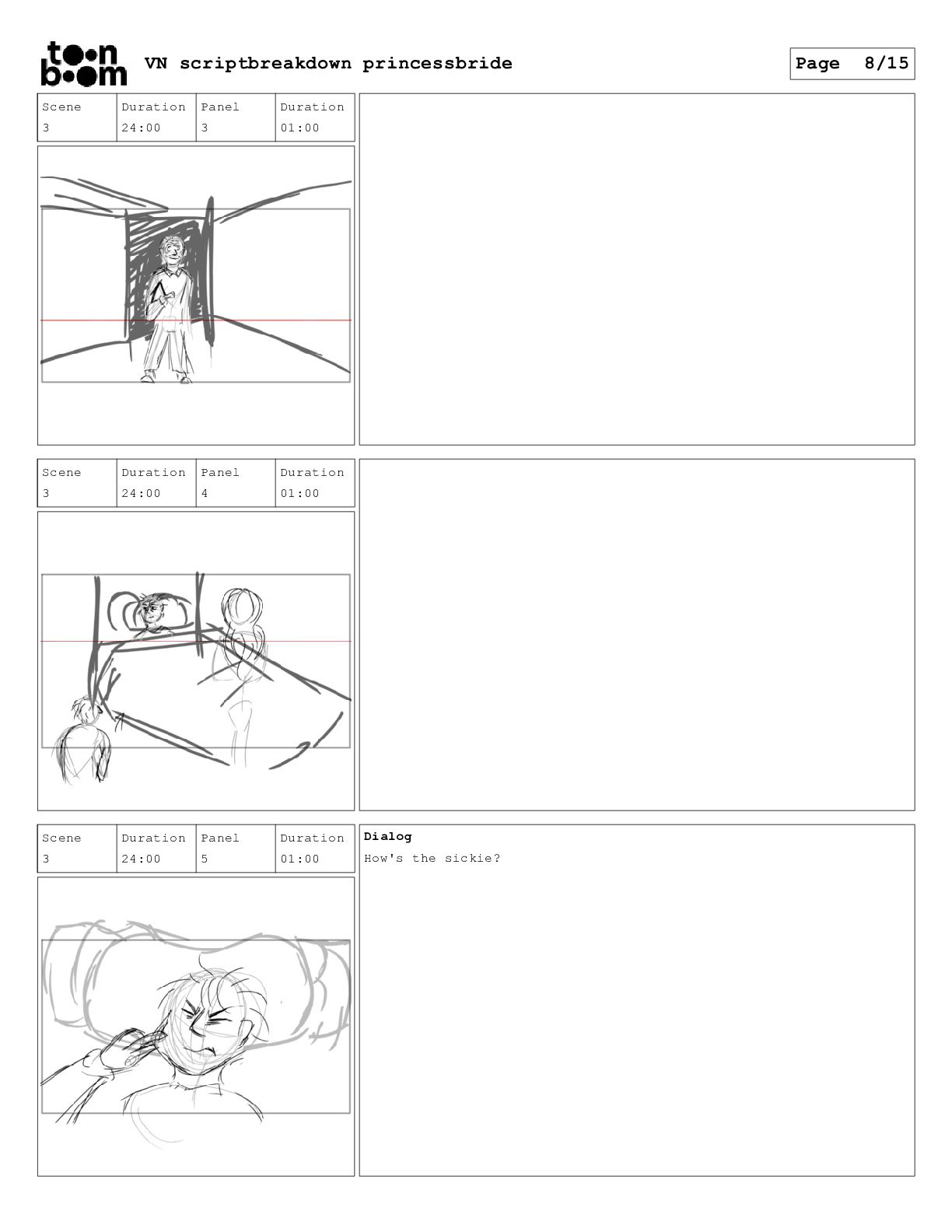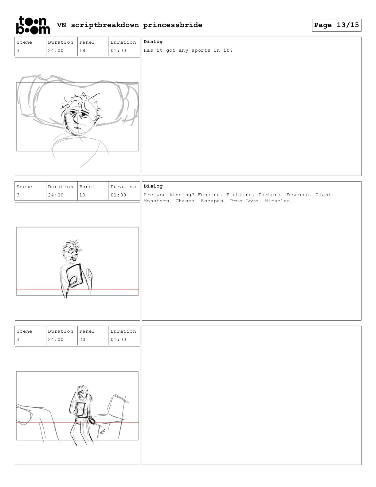 book? Scene 3 Duration 24:00 Panel 16 Duration 01:00 Dialog That's right. When I was your age, television was called books. Scene 3 Duration 24:00 Panel 17 Duration 01:00 Dialog And this is a very special book. It was the one my father used to read to me when I was sick and I used to read it to your father. VN scriptbreakdown princessbride Page 12/15