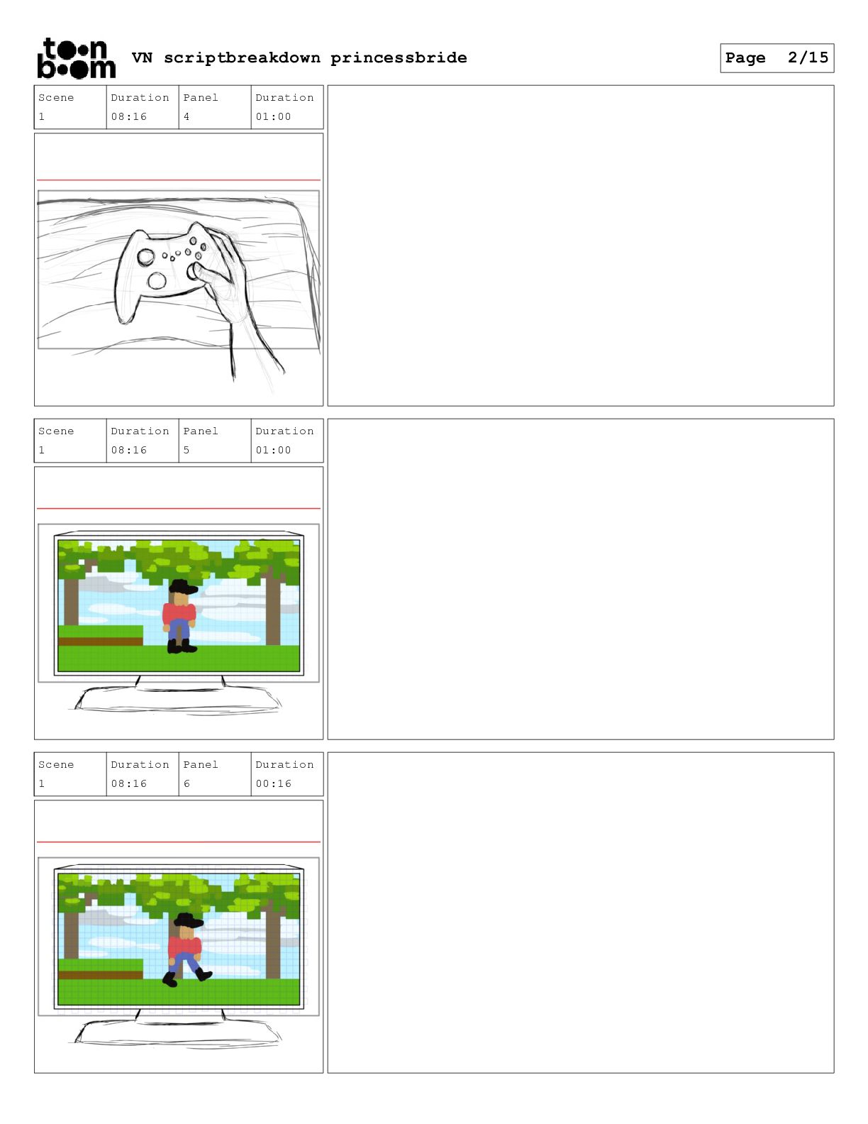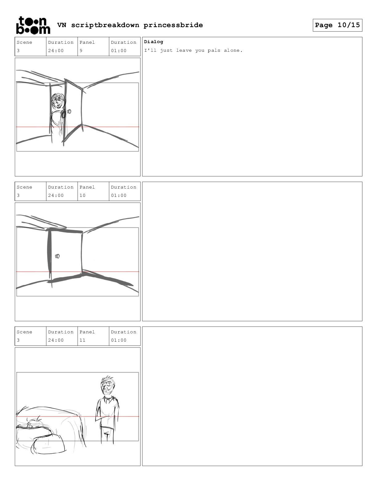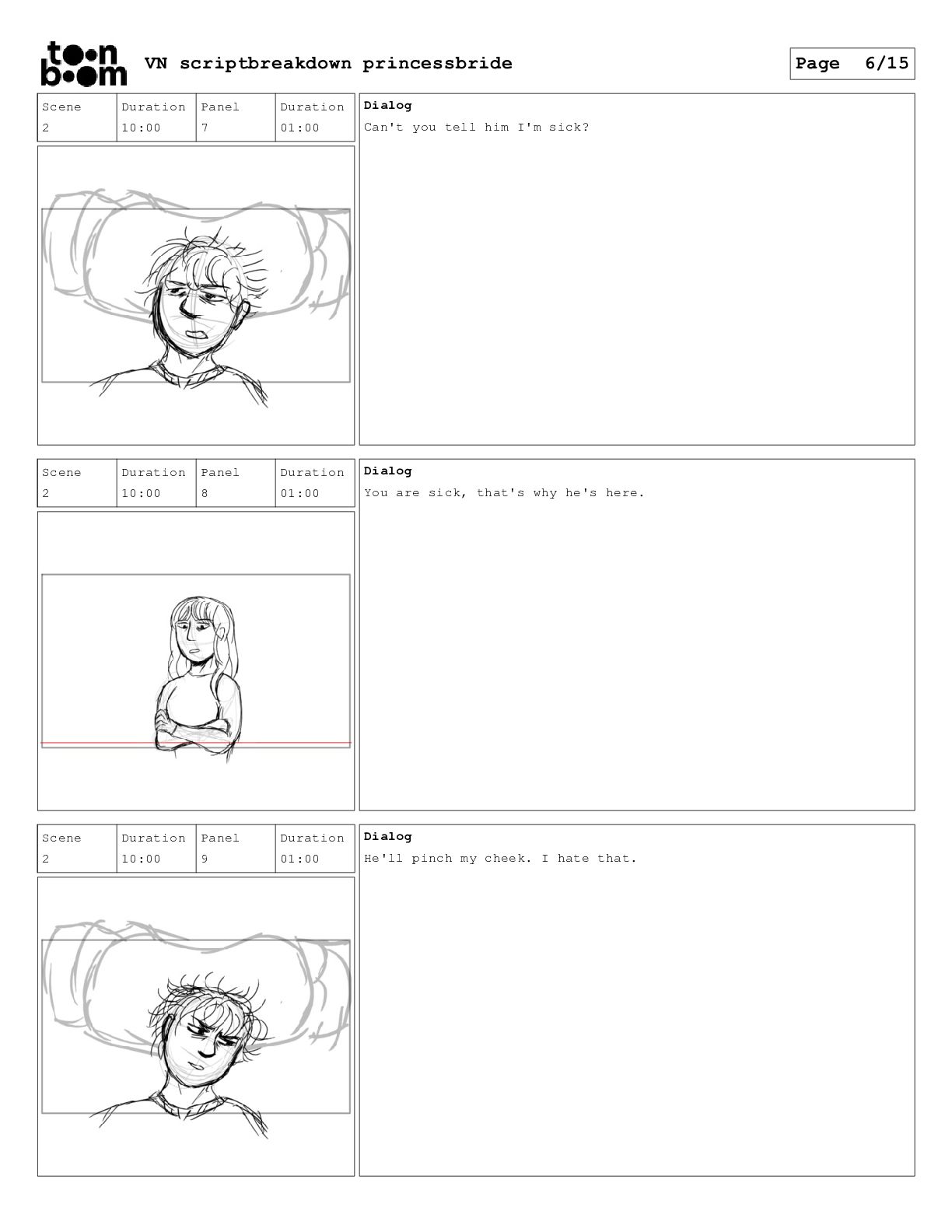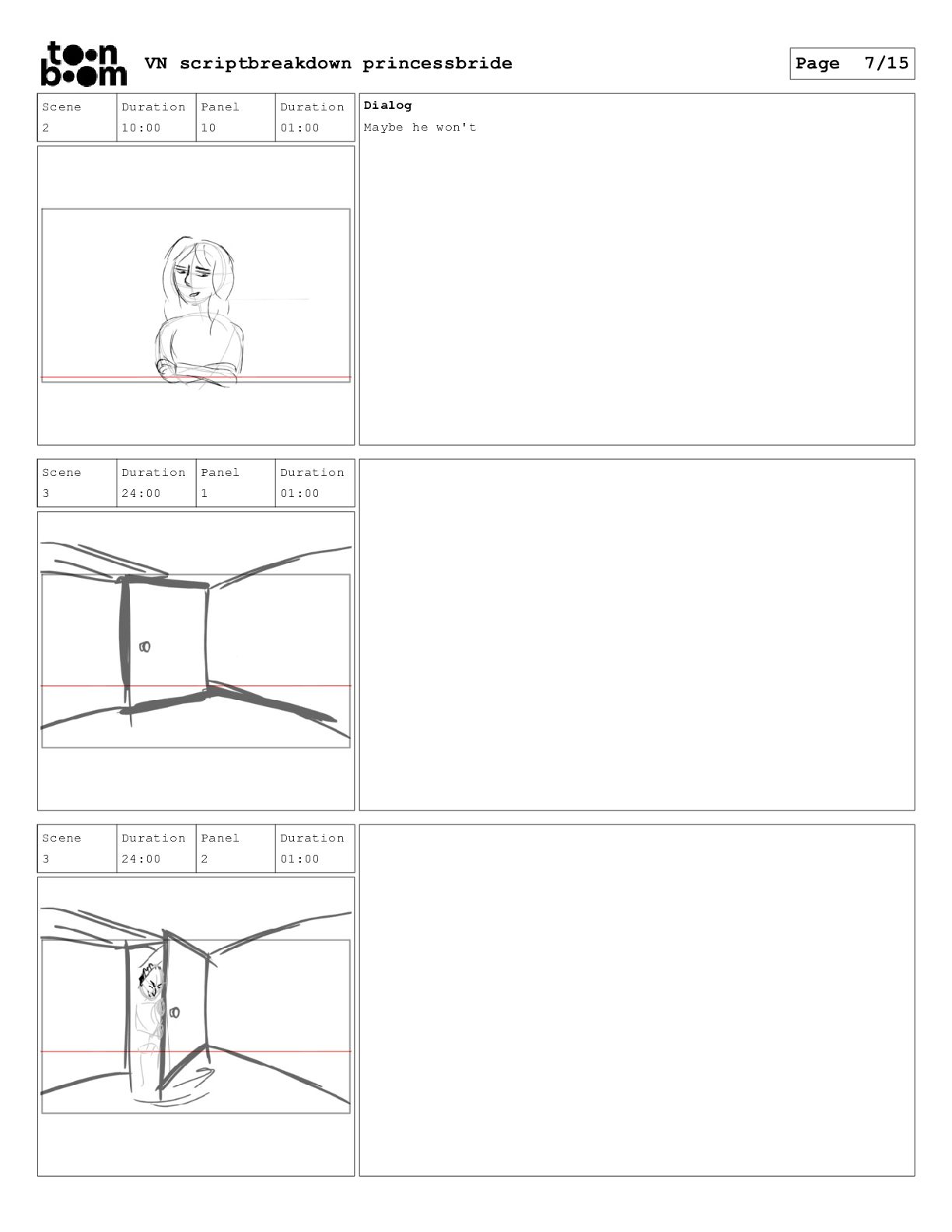 book? Scene 3 Duration 24:00 Panel 16 Duration 01:00 Dialog That's right. When I was your age, television was called books. Scene 3 Duration 24:00 Panel 17 Duration 01:00 Dialog And this is a very special book. It was the one my father used to read to me when I was sick and I used to read it to your father. VN scriptbreakdown princessbride Page 12/15