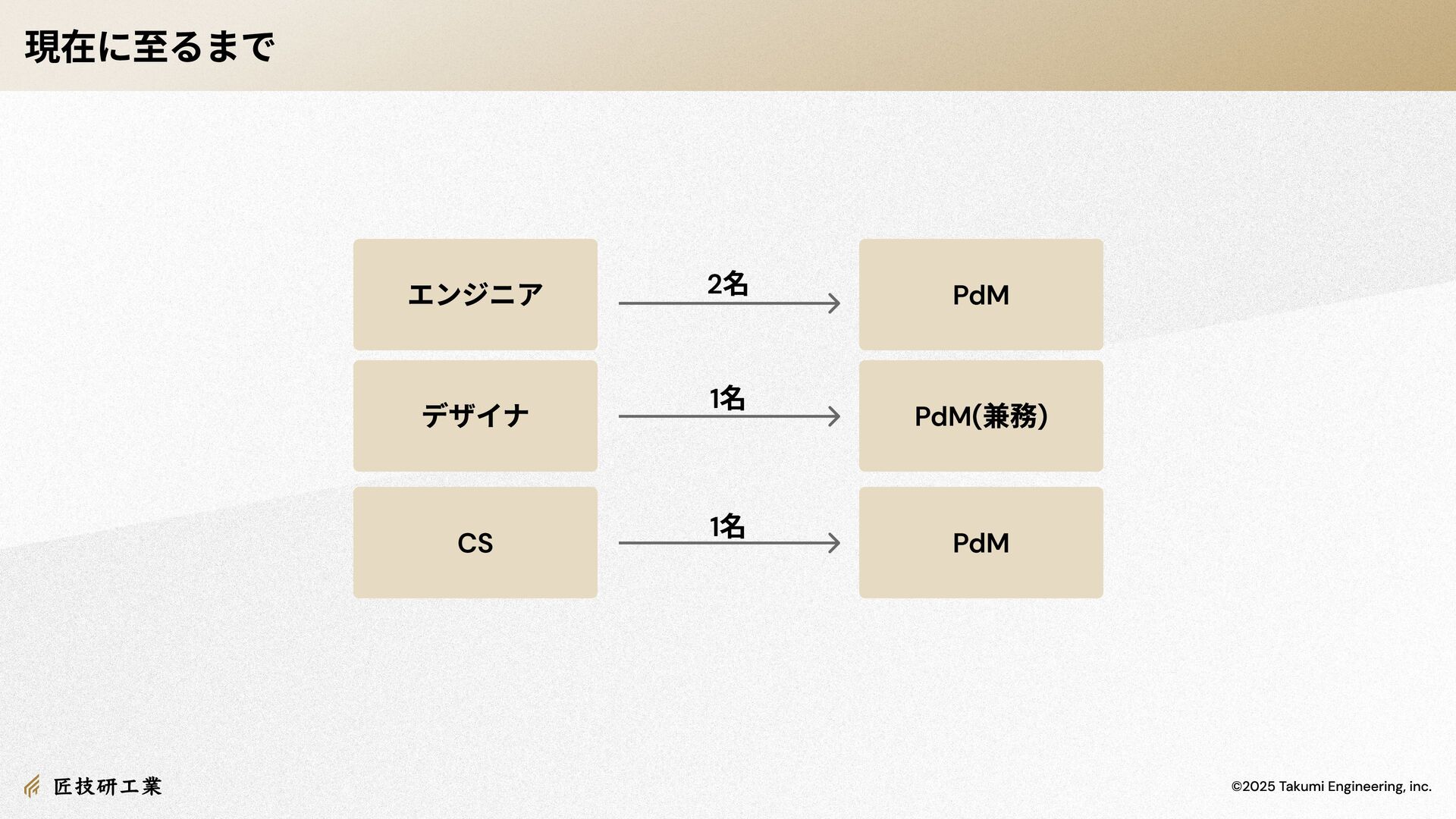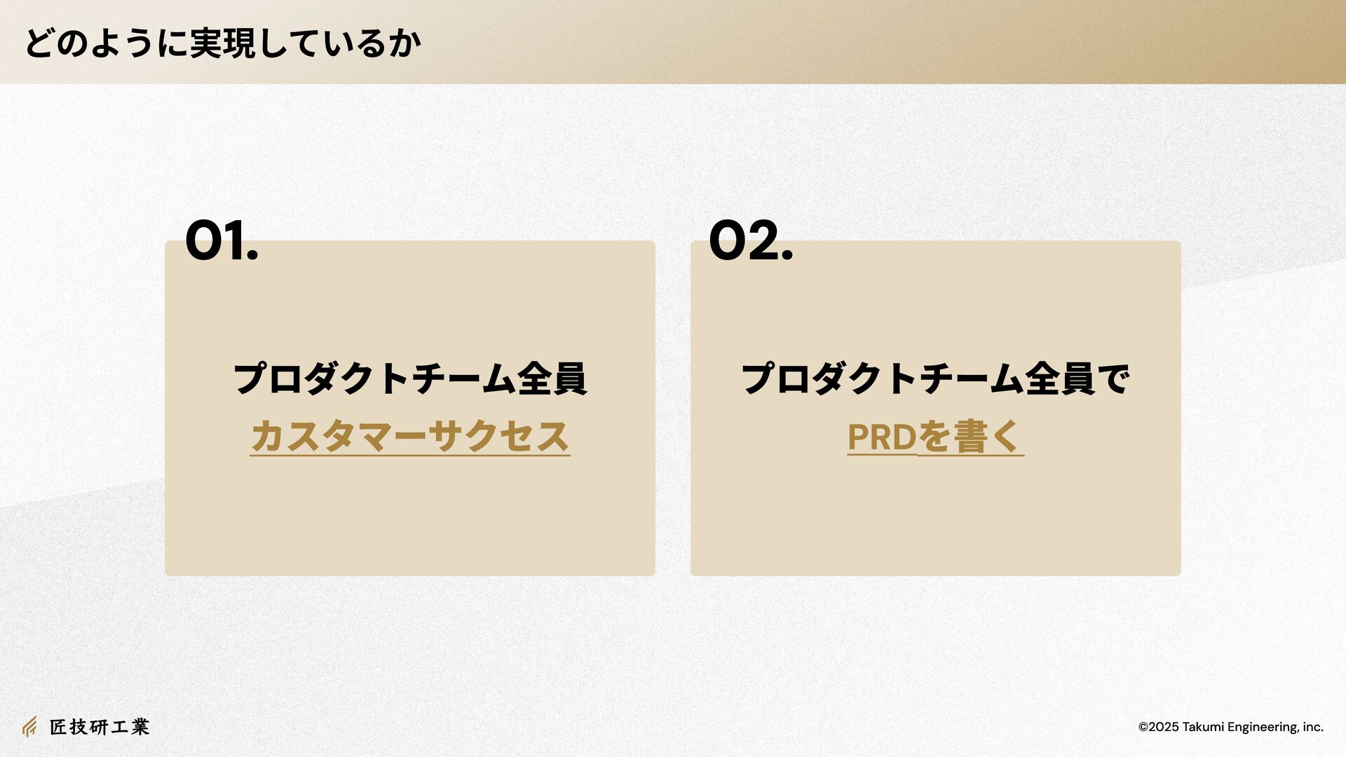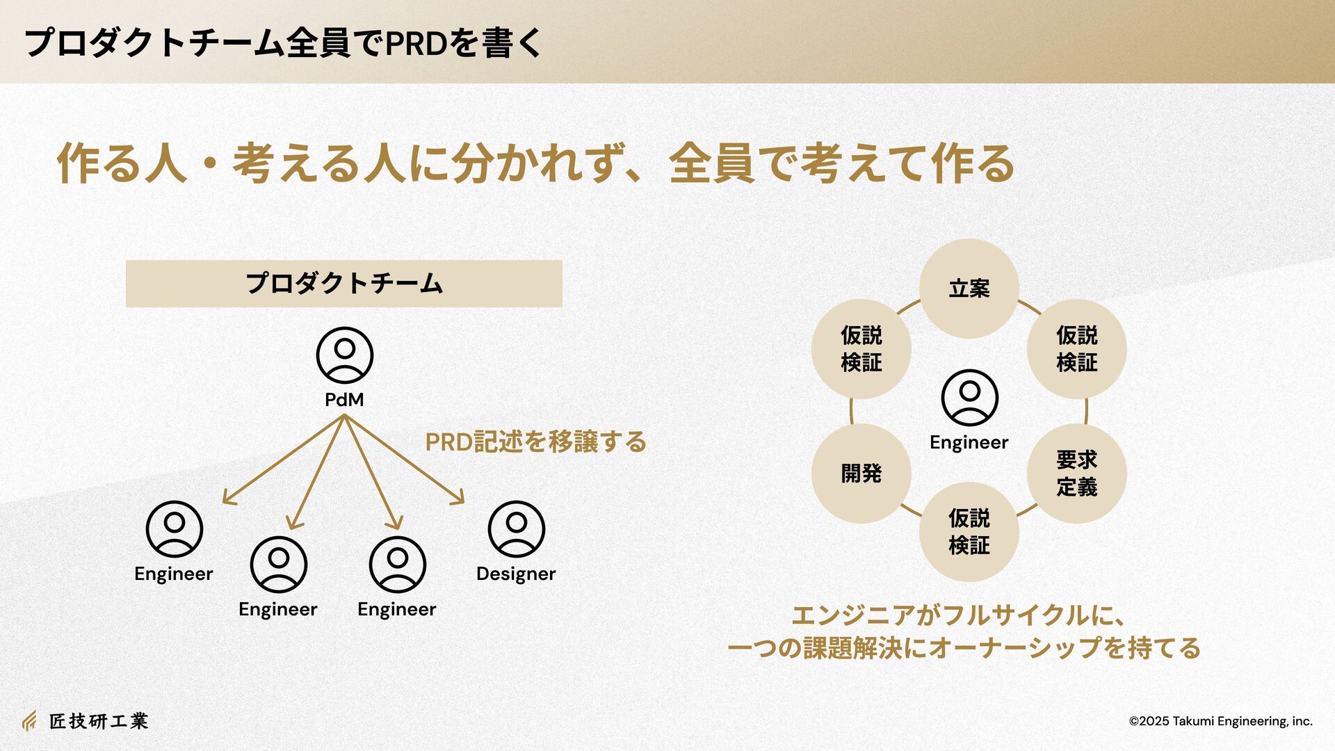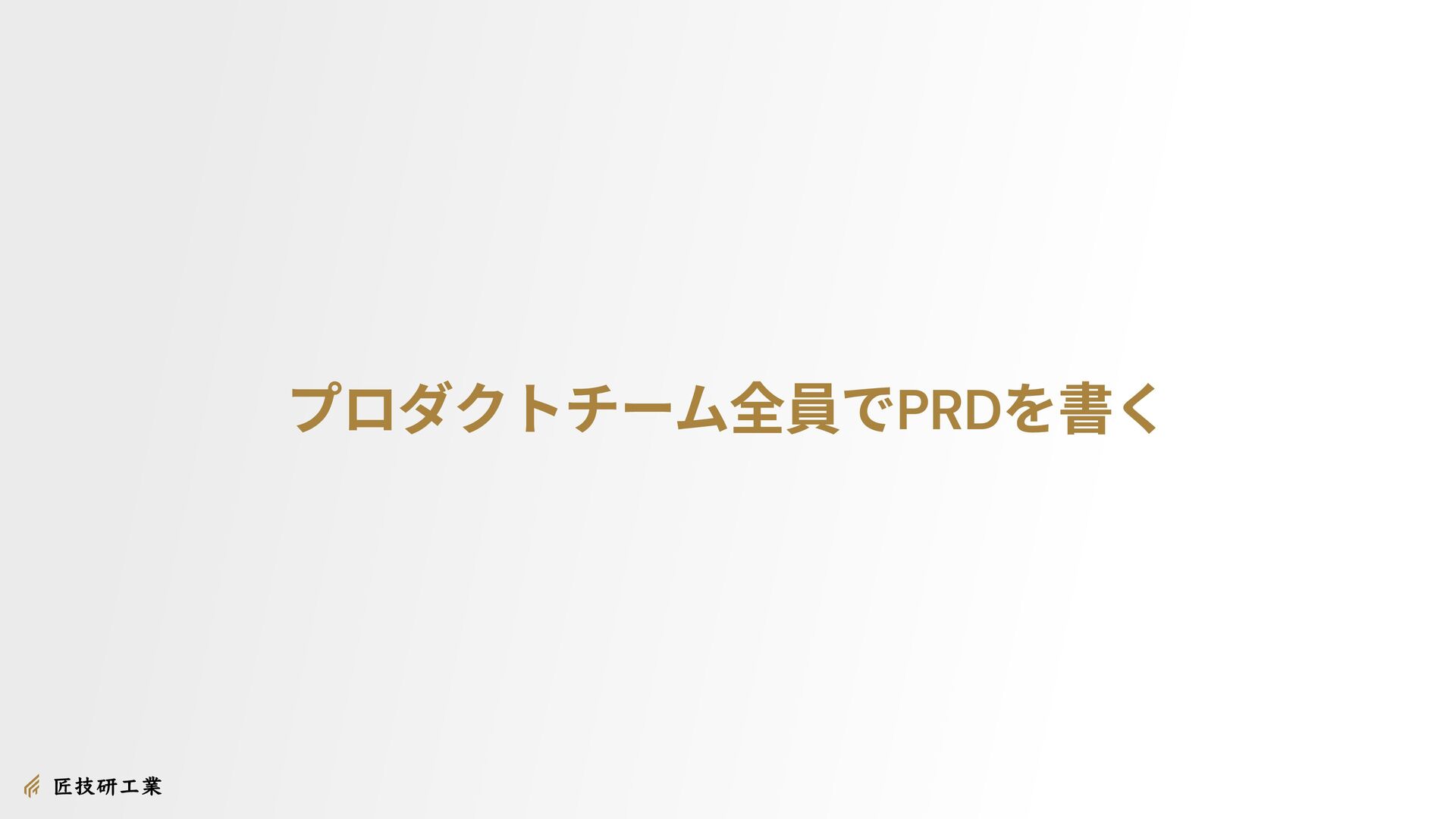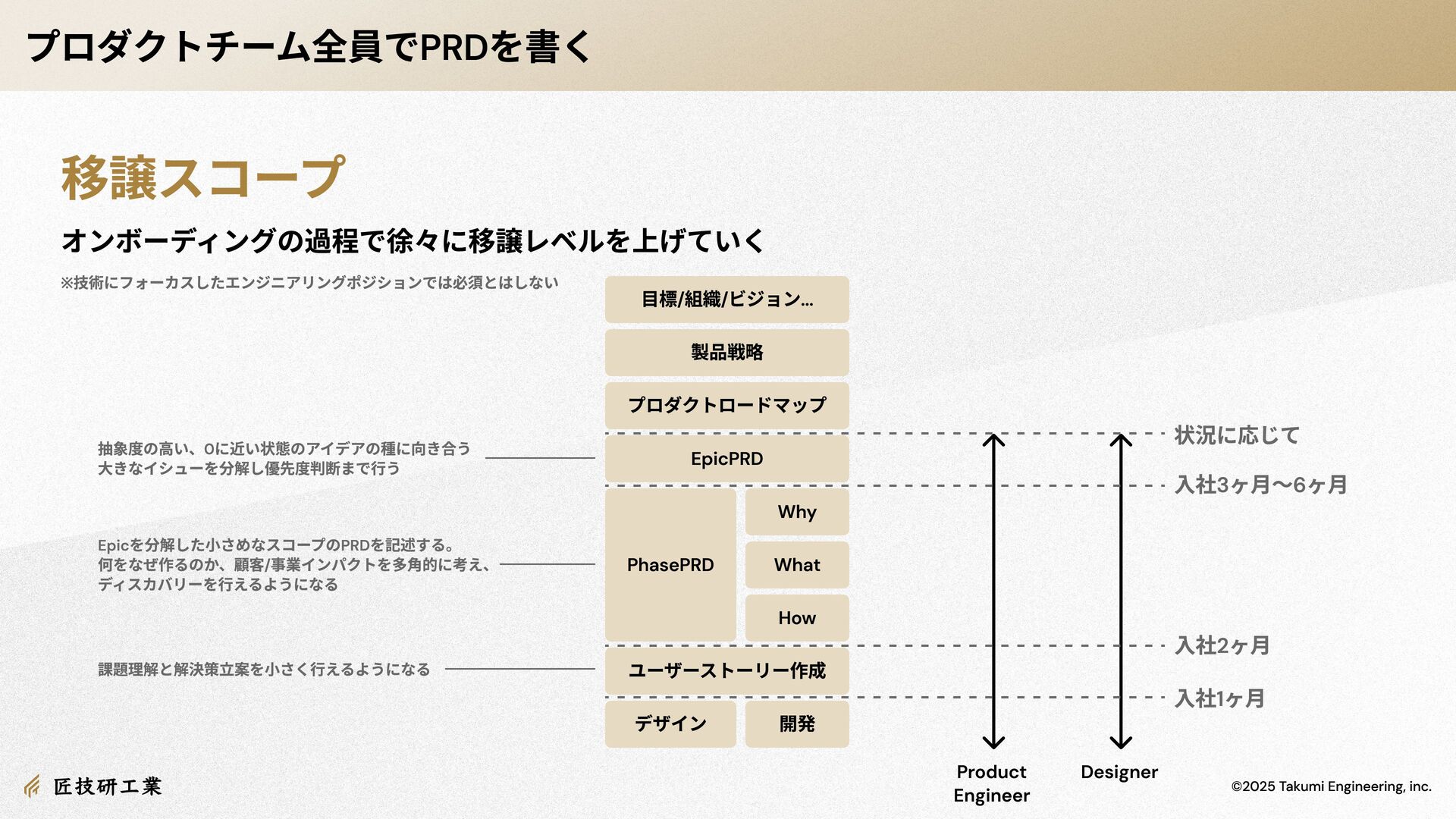 EpicPRD プロダクトロードマップ 製品戦略 目標/組織/ビジョン... How What Why PhasePRD Product Engineer Designer 入社1ヶ月 入社2ヶ月 入社3ヶ月〜6ヶ月 状況に応じて Epicを分解した小さめなスコープのPRDを記述する。 何をなぜ作るのか、顧客/事業インパクトを多角的に考え、 ディスカバリーを行えるようになる 課題理解と解決策立案を小さく行えるようになる ※技術にフォーカスしたエンジニアリングポジションでは必須とはしない 抽象度の高い、0に近い状態のアイデアの種に向き合う 大きなイシューを分解し優先度判断まで行う