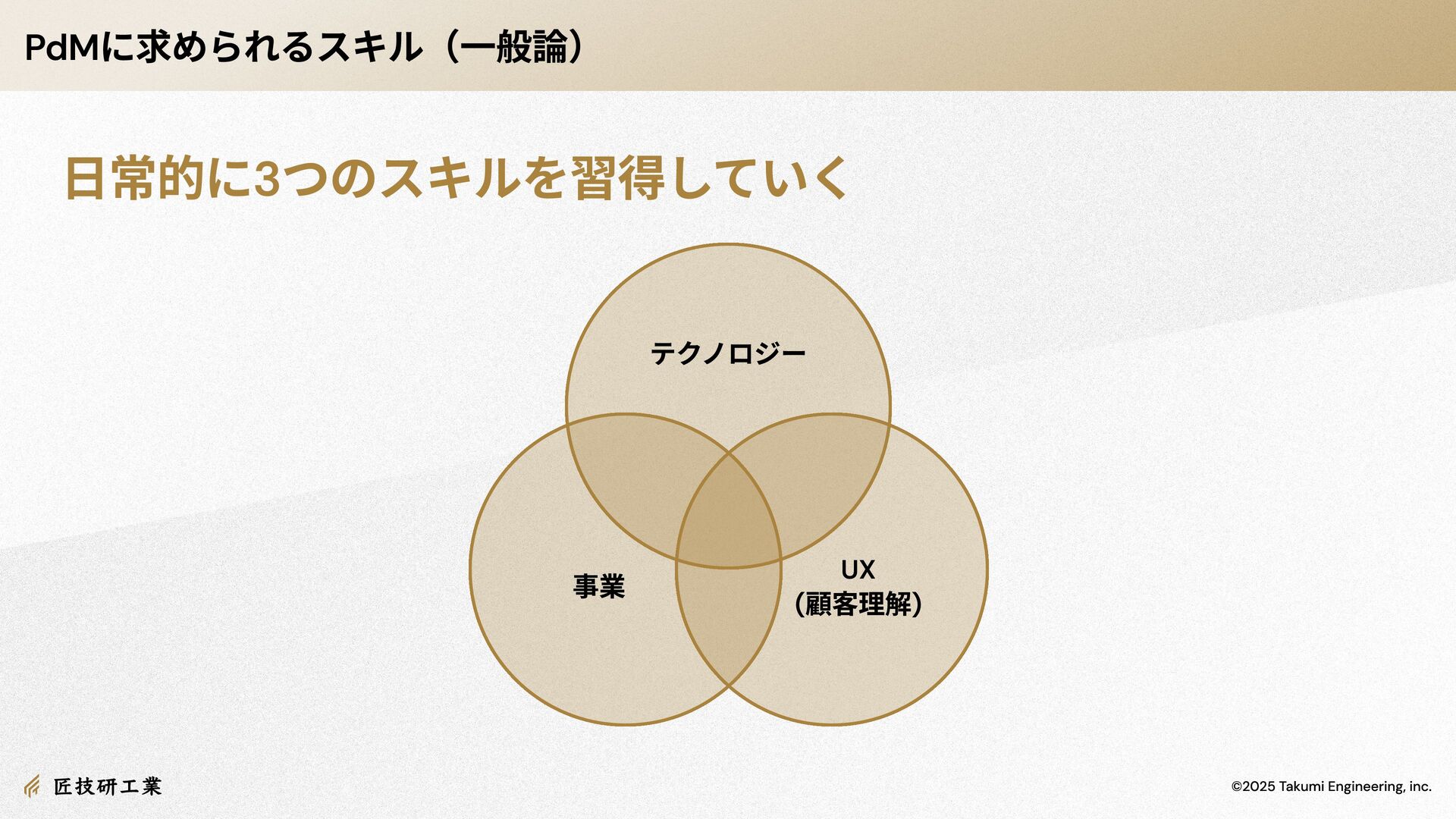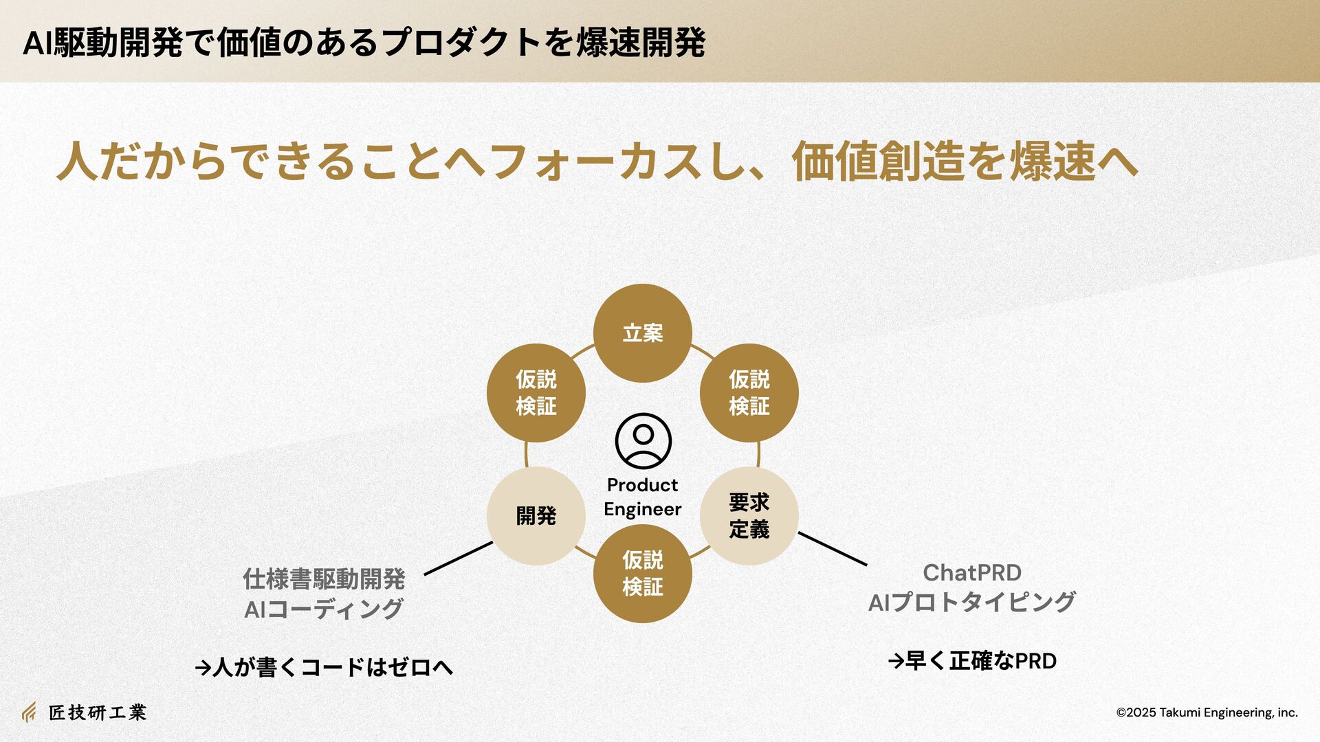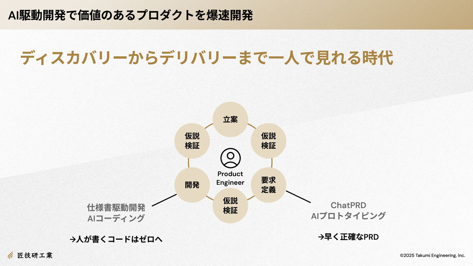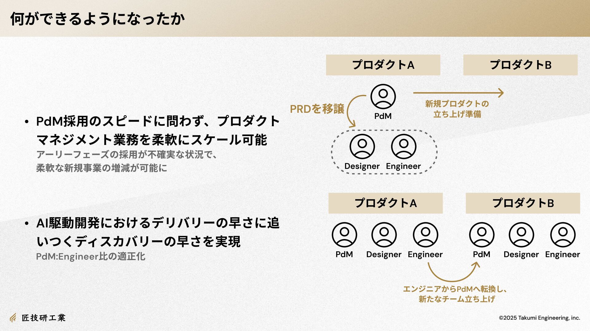 EpicPRD プロダクトロードマップ 製品戦略 目標/組織/ビジョン... How What Why PhasePRD Product Engineer Designer 入社1ヶ月 入社2ヶ月 入社3ヶ月〜6ヶ月 状況に応じて Epicを分解した小さめなスコープのPRDを記述する。 何をなぜ作るのか、顧客/事業インパクトを多角的に考え、 ディスカバリーを行えるようになる 課題理解と解決策立案を小さく行えるようになる ※技術にフォーカスしたエンジニアリングポジションでは必須とはしない 抽象度の高い、0に近い状態のアイデアの種に向き合う 大きなイシューを分解し優先度判断まで行う