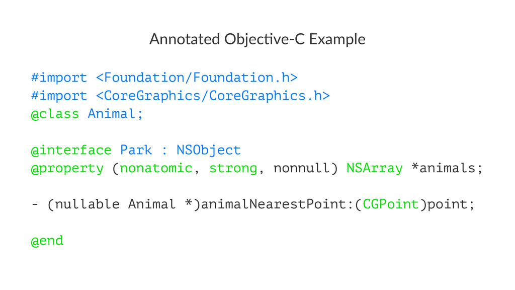 Annotated(Objec-ve/C(Example #import <Foundation/Foundation.h> #import <CoreGraphics/CoreGraphics.h> @class Animal; @interface Park :
