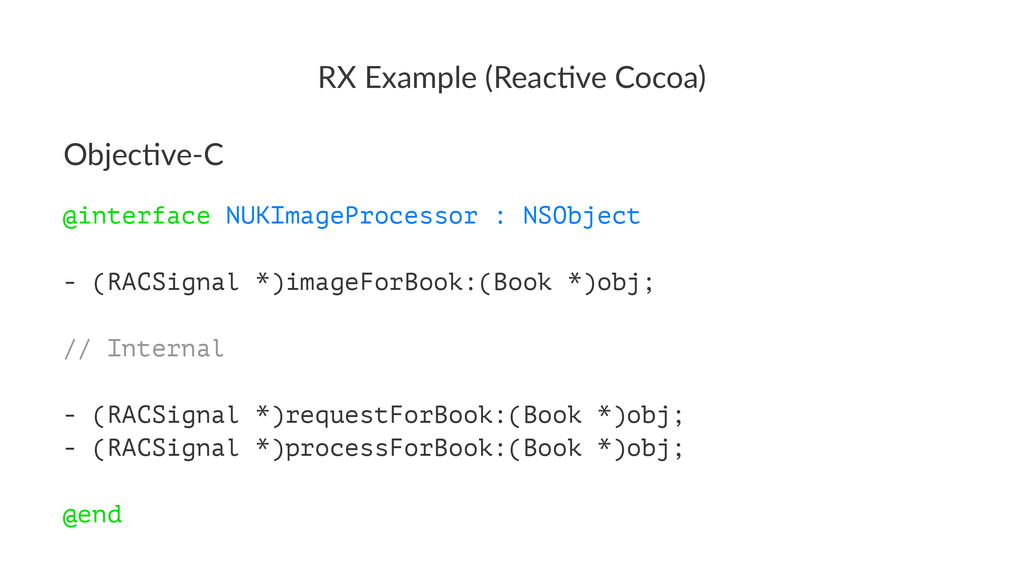 RX#Example#(Reac-ve#Cocoa) Objec&ve(C @interface NUKImageProcessor : NSObject - (RACSignal *)imageForBook:(Book *)obj;