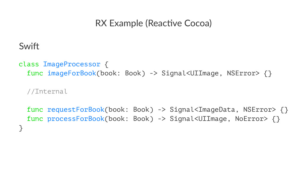 RX#Example#(Reac-ve#Cocoa) Swi$ class ImageProcessor { func imageForBook(book: Book) -> Signal<UIImage,