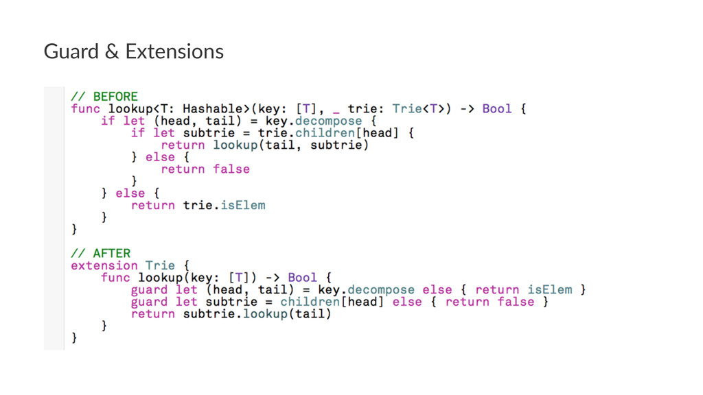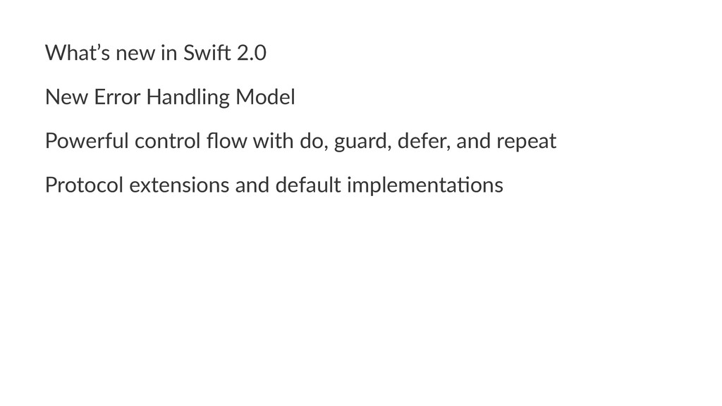 What’s'new'in'Swi-'2.0 New$Error$Handling$Model Powerful)control)flow)with)do,)guard,)defer,)and)repeat Protocol'extensions'and'default'implementa3ons