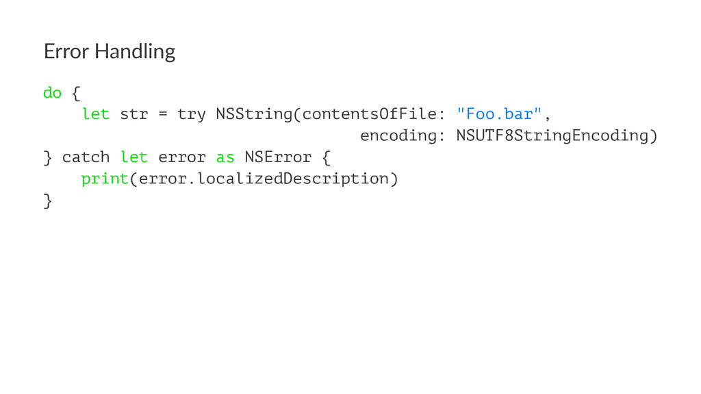 Error$Handling do { let str = try NSString(contentsOfFile: "Foo.bar", encoding: