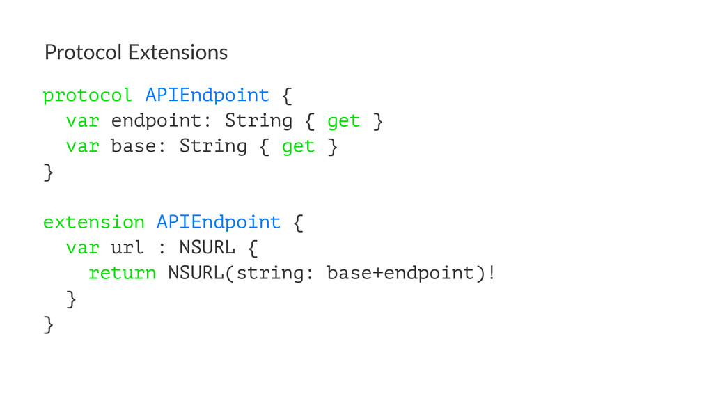 var base: String { get } } extension APIEndpoint { var url : NSURL { return NSURL(string: base+endpoint)! } }