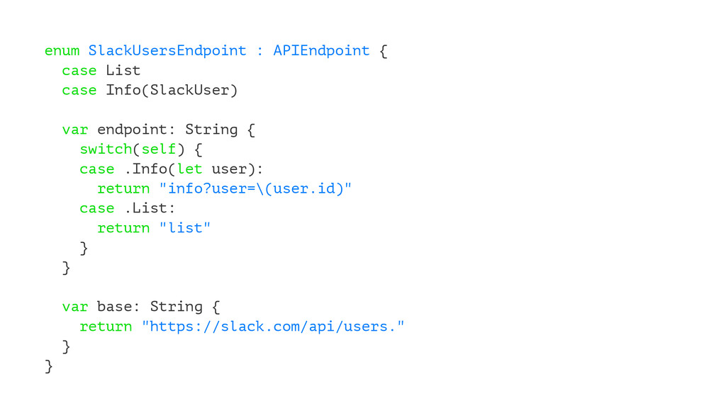 enum SlackUsersEndpoint : APIEndpoint { case List case Info(SlackUser) var