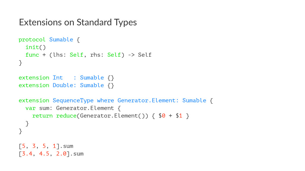 Self) -> Self } extension Int : Sumable {} extension Double: Sumable {} extension SequenceType where Generator.Element: Sumable { var sum: Generator.Element { return reduce(Generator.Element()) { $0 + $1 } } } [5, 3, 5, 1].sum [3.4, 4.5, 2.0].sum
