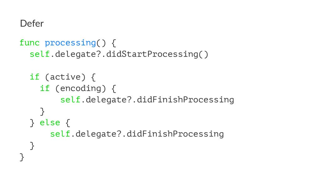 Defer func processing() { self.delegate?.didStartProcessing() if (active) { if (encoding)