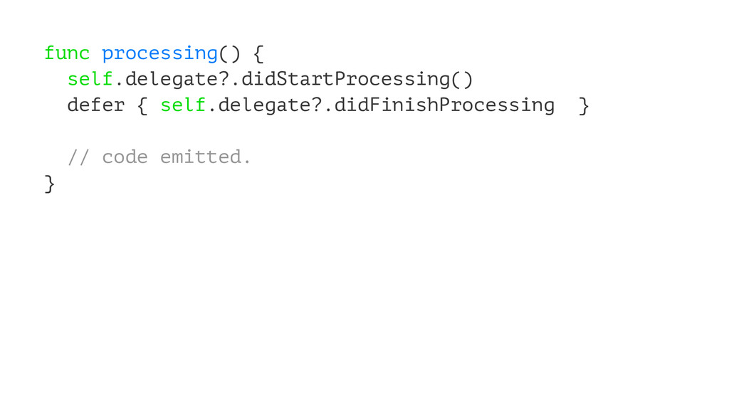 func processing() { self.delegate?.didStartProcessing() defer { self.delegate?.didFinishProcessing } // code