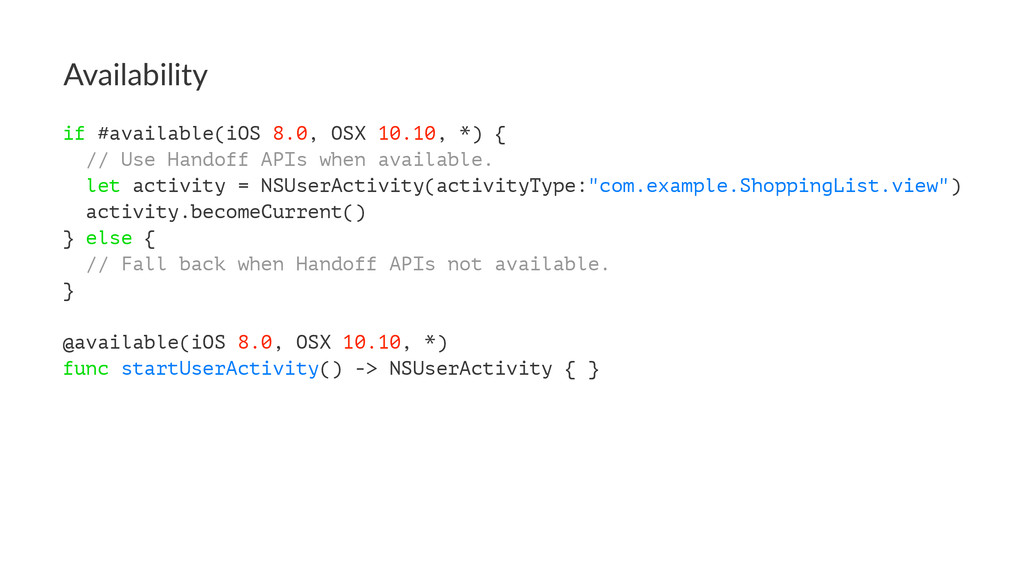 Handoff APIs when available. let activity = NSUserActivity(activityType:"com.example.ShoppingList.view") activity.becomeCurrent() } else { // Fall back when Handoff APIs not available. } @available(iOS 8.0, OSX 10.10, *) func startUserActivity() -> NSUserActivity { }