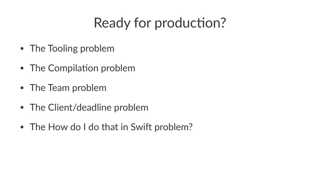 Ready&for&produc-on? • The%Tooling%problem • The%Compila1on%problem • The%Team%problem • The%Client/deadline%problem •