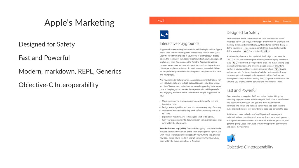 Apple's'Marke,ng Designed(for(Safety Fast%and%Powerful Modern,(markdown,(REPL,(Generics Objec&ve(C*Interoperability