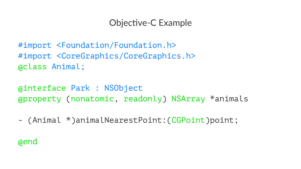 Objec&ve(C*Example #import <Foundation/Foundation.h> #import <CoreGraphics/CoreGraphics.h> @class Animal; @interface Park :