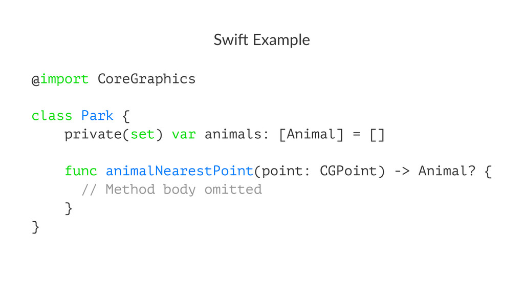 Swi$%Example @import CoreGraphics class Park { private(set) var animals: [Animal]