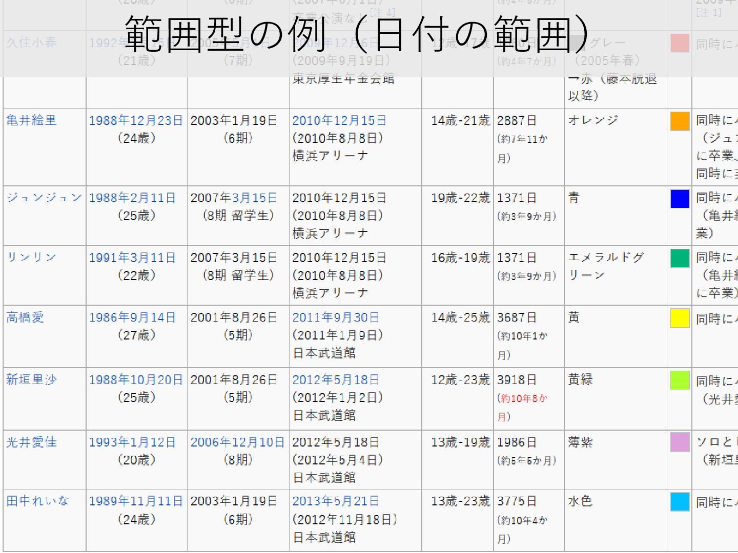 text ); insert into members(birthday, period, name_en) values ('1988-10-20', '[2001-08-26, 2012-05-18]', 'Risa Niigaki'), ('1988-12-23', '[2003-01-19, 2010-12-15]', 'Eri Kamei'), ('1989-11-11', '[2003-01-19, 2013-05-21]', 'Reina Tanaka'), ('1989-07-13', '[2003-01-19,]', 'Sayumi Michishige'), ('1985-02-26', '[2003-01-19, 2007-06-01]', 'Miki Fujimoto'), ...