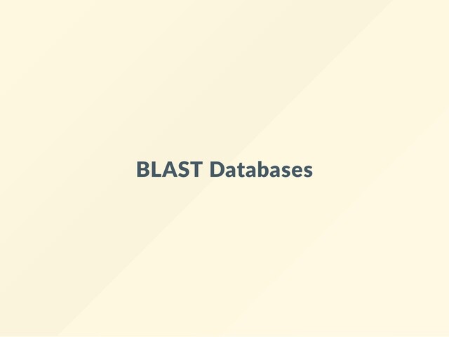 a t e _ b l a s t d b . p l - - p a s s i v e - - d e c o m p r e s s 1 6 S _ r i b o s o m a l _ R N A What is stored in this database? b l a s t d b c m d - d b 1 6 S _ r i b o s o m a l _ R N A - e n t r y a l l | h e a d Prints the content of the database: > N R _ 1 1 8 8 8 9 . 1 A m y c o l a t o p s i s a z u r e a s t r a i n N R R L 1 1 4 1 2 1 6 S r i b o s o m a G G T C T N A T A C C G G A T A T A A C A A C T C A T G G C A T G G T T G G T A G T G G A A A G C T C C G G C G G T A C G G G A C A G C T T G T T G G T G G G G T A A T G G C C T A C C A A G G C G A C G A C G G G T A G C C G G C C T G A G A G G G T G A C C . . .