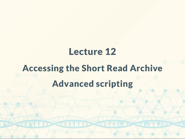 contain? 2. What type of information ought to be there but is not? cat runinfo.csv | cut -f 1-100 -d , | head -1 prints: Run,ReleaseDate,LoadDate,spots,bases,spots_with_mates, avgLength,size_MB,AssemblyName,download_path,Experiment, LibraryName,LibraryStrategy,LibrarySelection,LibrarySource, LibraryLayout,InsertSize,InsertDev,Platform,Model,SRAStudy, BioProject,Study_Pubmed_id,ProjectID,Sample,BioSample,SampleType ...