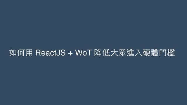 ReactJS 套件化組裝,可以輕易把套件跟封 裝成跑在各平台上 降低開發⾨門檻 ◎ 把每個 firmware 想像是⼀一個app, maker 可以分享⾃自⼰己設計的 firmware 創造出獨特 app store ⽣生 態系,讓⼤大眾直接⽤用安裝 app 的⽅方 式快速部署到 device 上 易上⼿手 firmware 更新機制 # 只要在任何⾏行動機器上開啟 web, 隨時都可以對任何 device 控制 or 看 其現在狀態 Control / Display $ 所有的開發跟debug模式都可以在 web上執⾏行,不需考量windows/mac 作業環境 開發/ debug ⼿手機/ 電腦/ 平板端 z