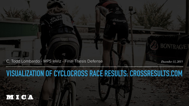 results are a common approach for timed competitions of any kind. There is little contextual information given in a simple table and a reader would have to skim up or down the results page to determine the information they seek. If the reader were a participant in the race, there may be other information useful and relevant to them as they view the results. What is Cyclocross? Cyclocross is one of the fastest growing two-wheeled sports in the USA. The races area a circuit that traverse a mix of terrains: grass, pavement, dirt, and sand while presenting obstacles for riders to overcome. Some people call it a “Steeplechase on a bike.” The races often string out over the duration of the race so the racers at the back may still “feel” like they are racing their nearest competitors. Since race courses and race weather conditions can have a sever impact on the outcome, this data could be integrated with the final visual. Results are often posted on race day as the race and a popular community website: crossresults.com which aggregates the results for any racer to see their own history as well as compare themselves to others. There are far more recreational amateur level, even though competitive, racers than there are professionals at the elite level. While there may be one elite mens and women’s race categories there are often 12 additional categories of races for a wider range of ages and ability levels to participate. Enrichment and prediction Tabular race results provide little context nor do they give a sense of how a racer, fared among their peers over time. Aggregation of cyclocross race data over time can yield a data set which could predict how well racers may do in future races. This information may be interesting for those who are competitive at heart.