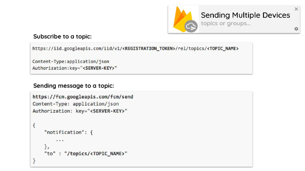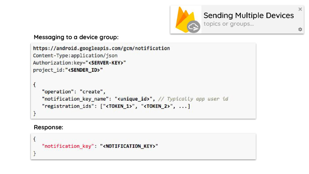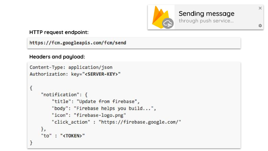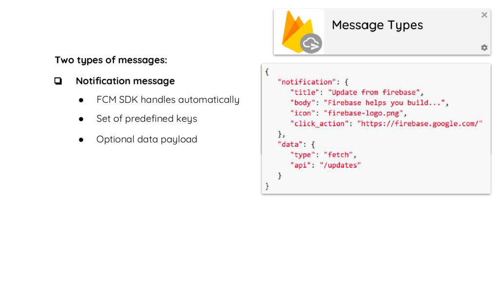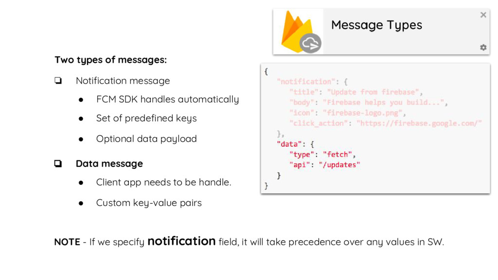 • Set of predefined keys • Optional data payload • FCM SDK handles automatically • Client app needs to be handle. • Custom key-value pairs NOTE - If we specify notification field, it will take precedence over any values in SW.