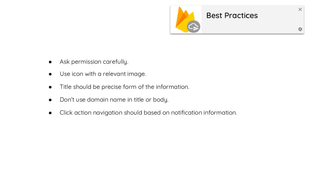 image. • Title should be precise form of the information. • Don’t use domain name in title or body. • Click action navigation should based on notification information.