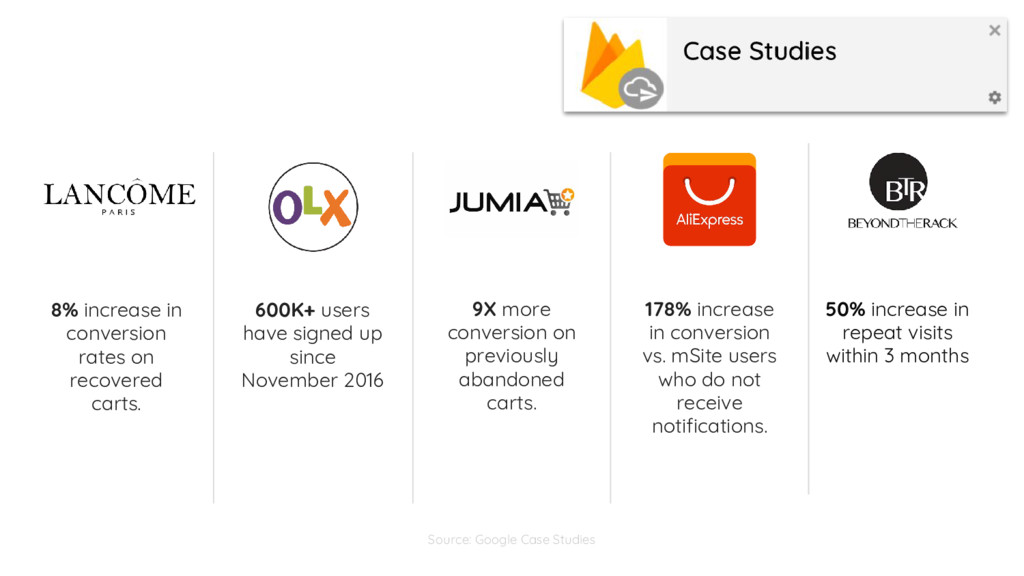 have signed up since November 2016 9X more conversion on previously abandoned carts. 178% increase in conversion vs. mSite users who do not receive notifications. 50% increase in repeat visits within 3 months Source: Google Case Studies