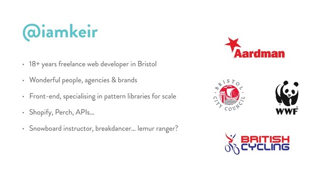 Wonderful people, agencies & brands • Front-end, specialising in pattern libraries for scale • Shopify, Perch, APIs… • Snowboard instructor, breakdancer… lemur ranger?