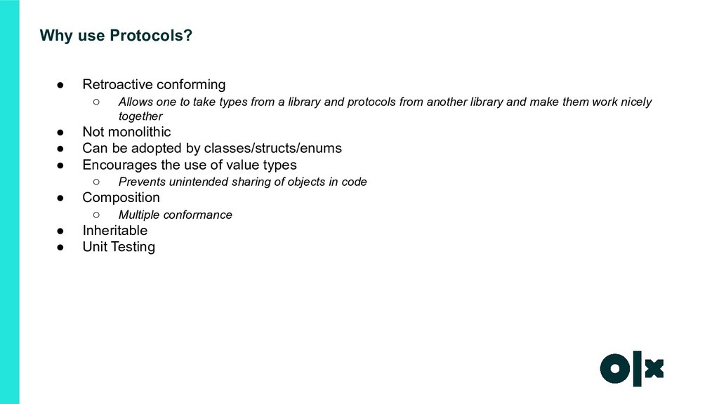 Advantages of Swift Protocols & POP over conventional OOPs methodology. How Protocols help with injecting, testing and abstracting the code.