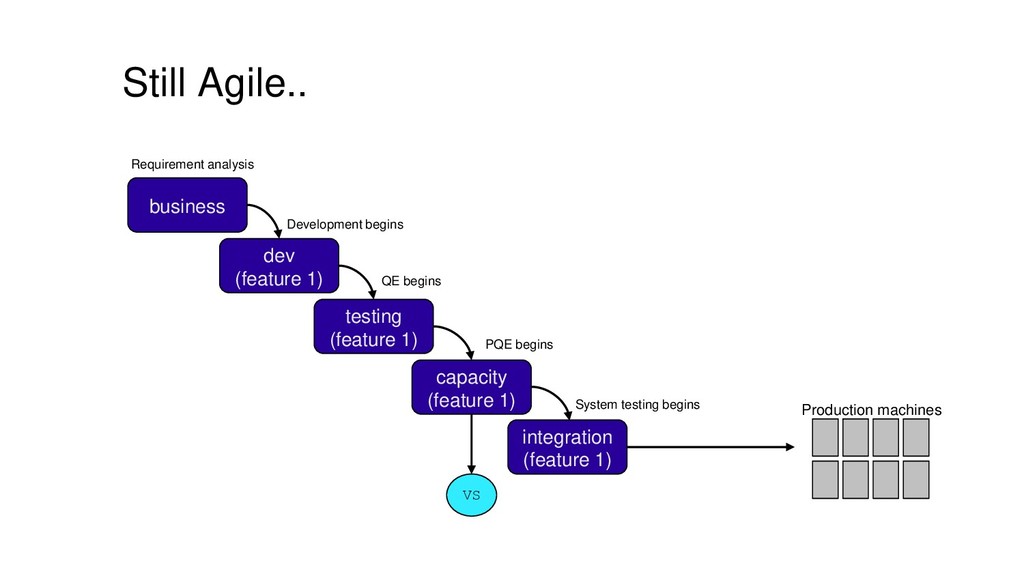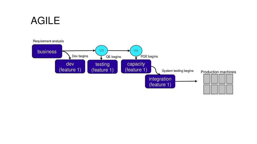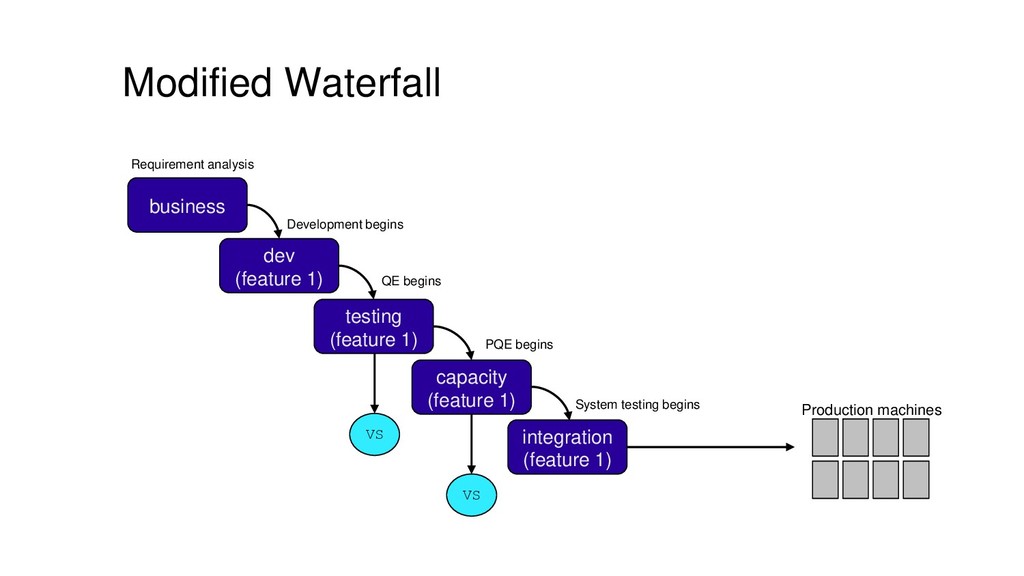 Production machines business Requirement analysis integration (feature 1) Dev begins QE begins PQE begins System testing begins VS VS