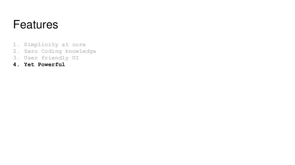 Features 1. Simplicity at core 2. Zero Coding knowledge 3.