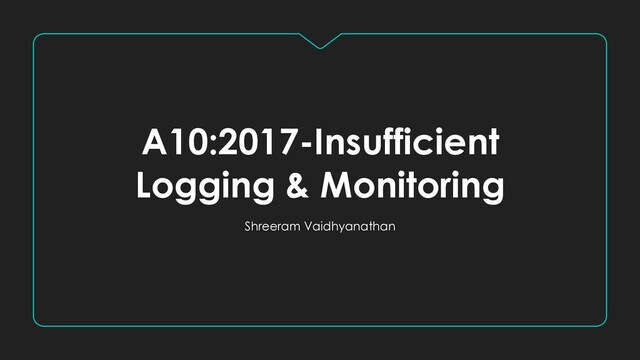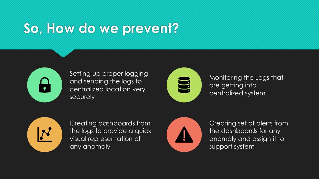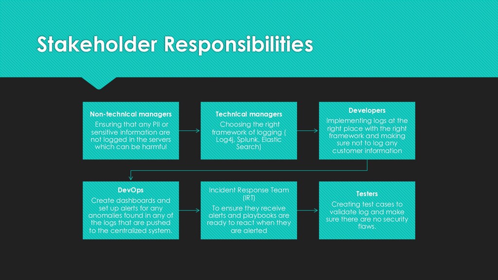 information are not logged in the servers which can be harmful Technical managers Choosing the right framework of logging ( Log4j, Splunk, Elastic Search) Developers Implementing logs at the right place with the right framework and making sure not to log any customer information DevOps Create dashboards and set up alerts for any anomalies found in any of the logs that are pushed to the centralized system. Incident Response Team (IRT) To ensure they receive alerts and playbooks are ready to react when they are alerted Testers Creating test cases to validate log and make sure there are no security flaws.
