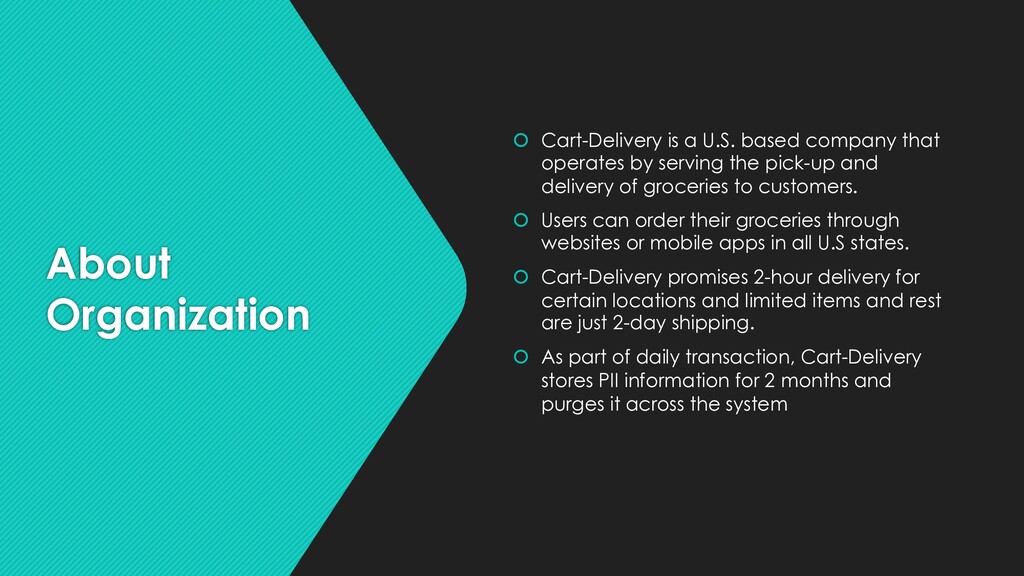 operates by serving the pick-up and delivery of groceries to customers. Users can order their groceries through websites or mobile apps in all U.S states. Cart-Delivery promises 2-hour delivery for certain locations and limited items and rest are just 2-day shipping. As part of daily transaction, Cart-Delivery stores PII information for 2 months and purges it across the system