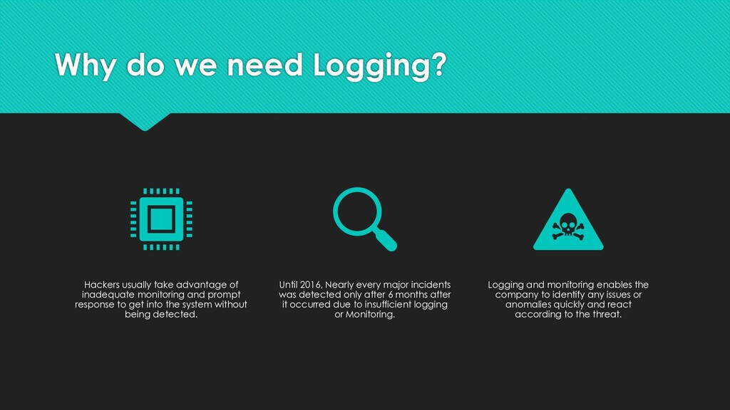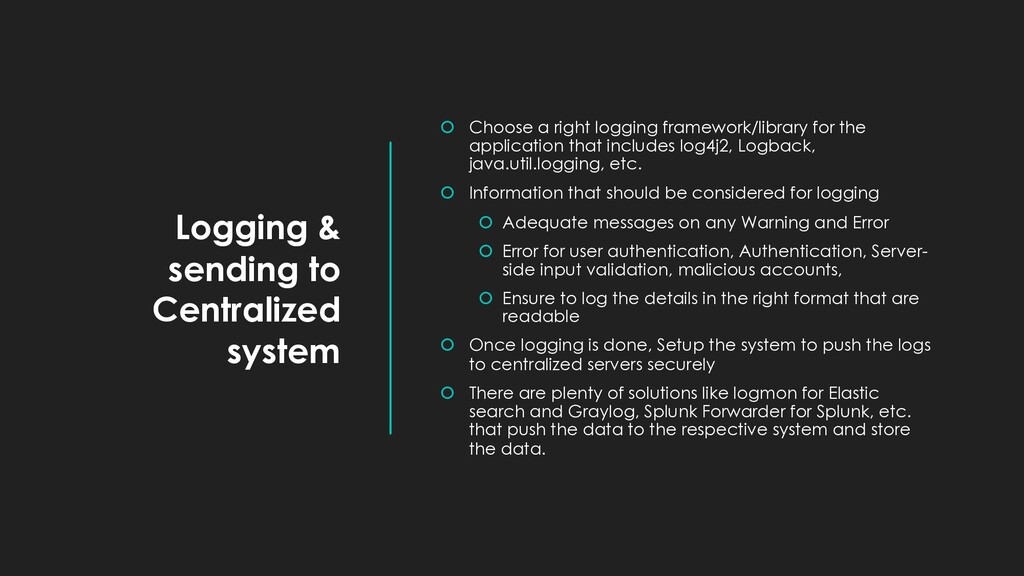 logging framework/library for the application that includes log4j2, Logback, java.util.logging, etc. Information that should be considered for logging Adequate messages on any Warning and Error Error for user authentication, Authentication, Server- side input validation, malicious accounts, Ensure to log the details in the right format that are readable Once logging is done, Setup the system to push the logs to centralized servers securely There are plenty of solutions like logmon for Elastic search and Graylog, Splunk Forwarder for Splunk, etc. that push the data to the respective system and store the data.