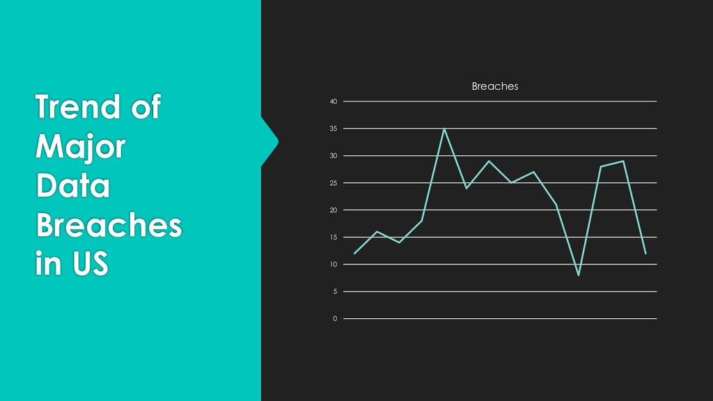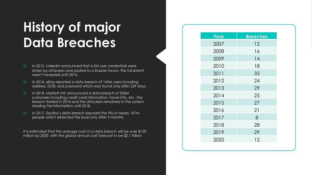 that 6.5M user credentials were stolen by attackers and posted to a Russian forum. The full extent wasn’t revealed until 2016. In 2014, eBay reported a data breach of 145M users including address, DOB, and password which was found only after 229 days. In 2018, Marriott Intl. announced a data breach of 500M customers including credit card information, travel info, etc. The breach started in 2014 and the attackers remained in the system stealing the information until 2018. In 2017, Equifax’s data breach exposed the PIIs of nearly 147M people which detected the issue only after 3 months. It is estimated that the average cost of a data breach will be over $150 million by 2020, with the global annual cost forecast to be $2.1 trillion Year Breaches 2007 12 2008 16 2009 14 2010 18 2011 35 2012 24 2013 29 2014 25 2015 27 2016 21 2017 8 2018 28 2019 29 2020 12
