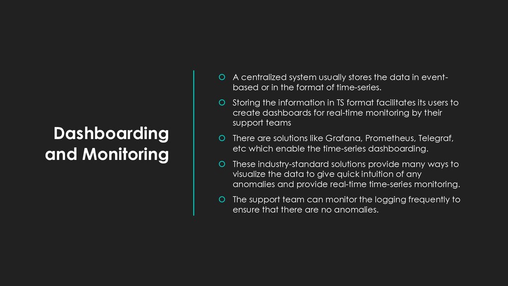 data in event- based or in the format of time-series. Storing the information in TS format facilitates its users to create dashboards for real-time monitoring by their support teams There are solutions like Grafana, Prometheus, Telegraf, etc which enable the time-series dashboarding. These industry-standard solutions provide many ways to visualize the data to give quick intuition of any anomalies and provide real-time time-series monitoring. The support team can monitor the logging frequently to ensure that there are no anomalies.