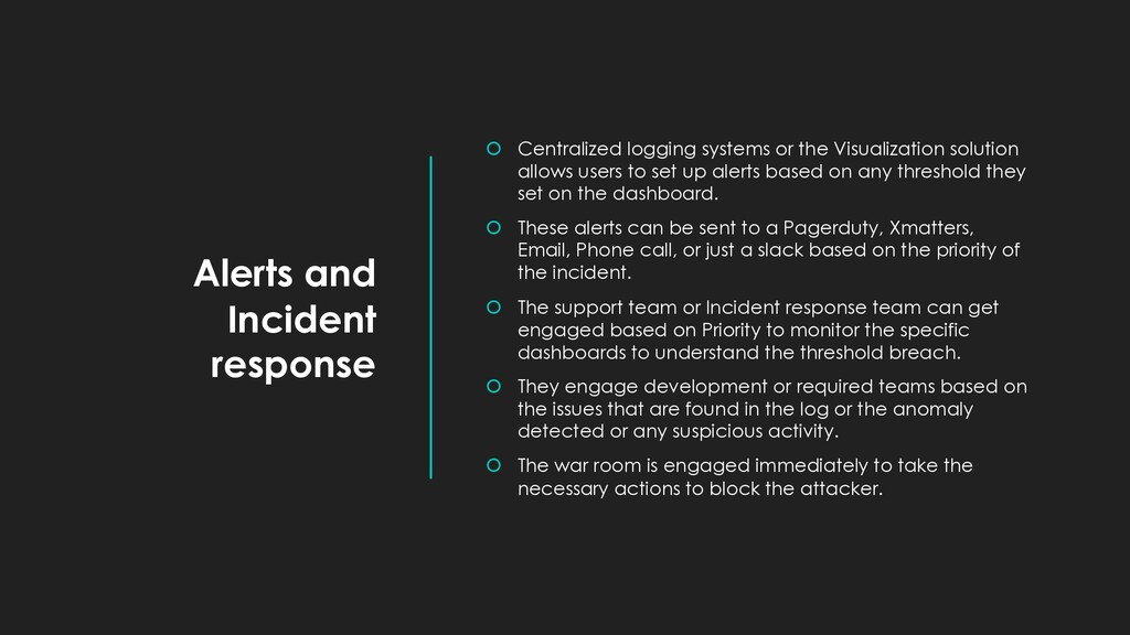 Visualization solution allows users to set up alerts based on any threshold they set on the dashboard. These alerts can be sent to a Pagerduty, Xmatters, Email, Phone call, or just a slack based on the priority of the incident. The support team or Incident response team can get engaged based on Priority to monitor the specific dashboards to understand the threshold breach. They engage development or required teams based on the issues that are found in the log or the anomaly detected or any suspicious activity. The war room is engaged immediately to take the necessary actions to block the attacker.