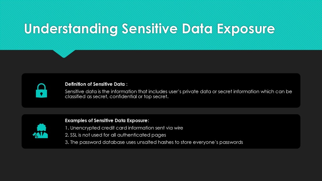 data is the information that includes user’s private data or secret information which can be classified as secret, confidential or top secret. Examples of Sensitive Data Exposure: 1. Unencrypted credit card information sent via wire 2. SSL is not used for all authenticated pages 3. The password database uses unsalted hashes to store everyone’s passwords