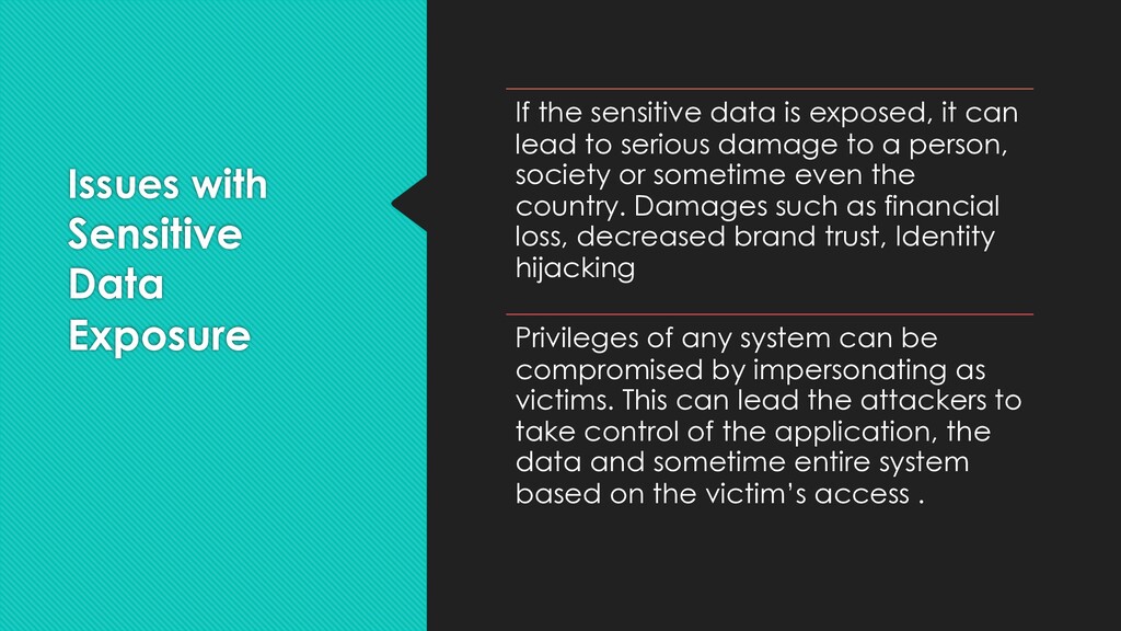 exposed, it can lead to serious damage to a person, society or sometime even the country. Damages such as financial loss, decreased brand trust, Identity hijacking Privileges of any system can be compromised by impersonating as victims. This can lead the attackers to take control of the application, the data and sometime entire system based on the victim’s access .