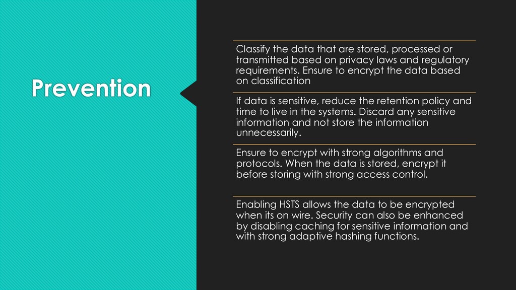 based on privacy laws and regulatory requirements. Ensure to encrypt the data based on classification If data is sensitive, reduce the retention policy and time to live in the systems. Discard any sensitive information and not store the information unnecessarily. Ensure to encrypt with strong algorithms and protocols. When the data is stored, encrypt it before storing with strong access control. Enabling HSTS allows the data to be encrypted when its on wire. Security can also be enhanced by disabling caching for sensitive information and with strong adaptive hashing functions.
