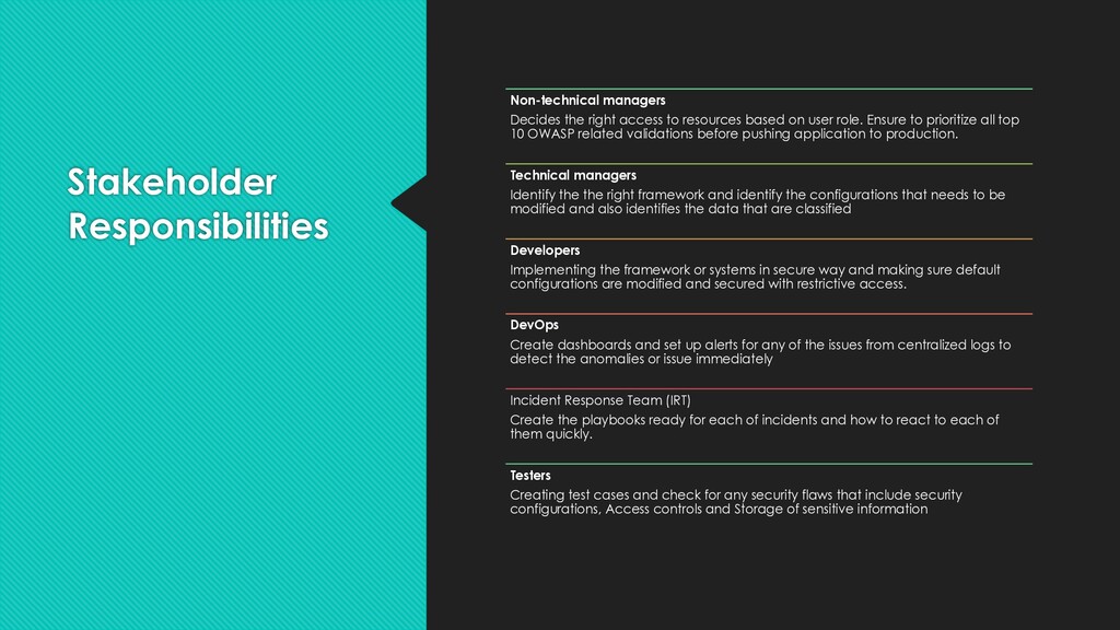 based on user role. Ensure to prioritize all top 10 OWASP related validations before pushing application to production. Technical managers Identify the the right framework and identify the configurations that needs to be modified and also identifies the data that are classified Developers Implementing the framework or systems in secure way and making sure default configurations are modified and secured with restrictive access. DevOps Create dashboards and set up alerts for any of the issues from centralized logs to detect the anomalies or issue immediately Testers Creating test cases and check for any security flaws that include security configurations, Access controls and Storage of sensitive information Incident Response Team (IRT) Create the playbooks ready for each of incidents and how to react to each of them quickly.