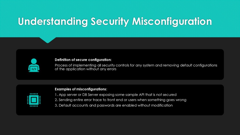 all security controls for any system and removing default configurations of the application without any errors Examples of misconfigurations: 1. App server or DB Server exposing some sample API that is not secured 2. Sending entire error trace to front end or users when something goes wrong 3. Default accounts and passwords are enabled without modification