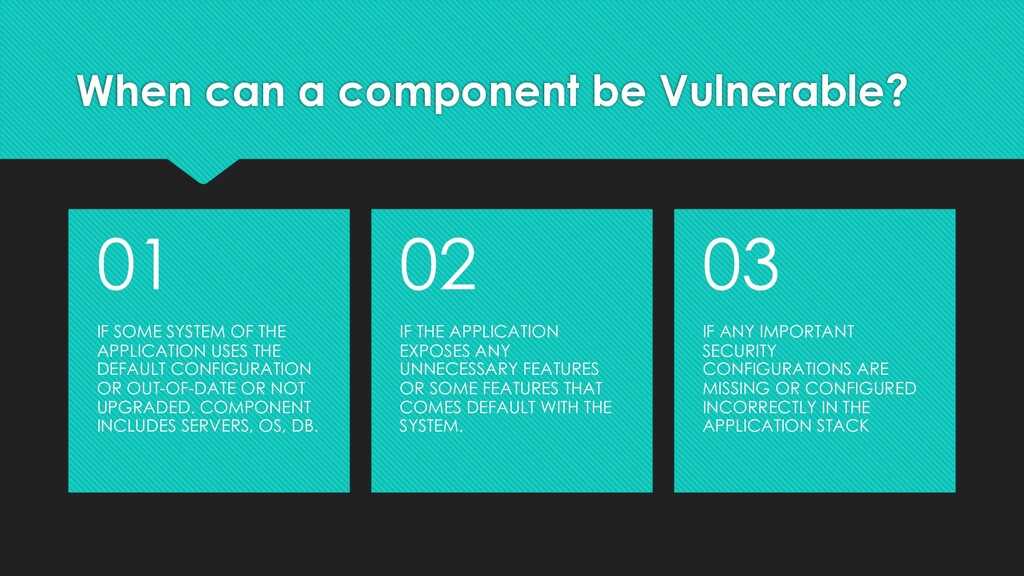 THE APPLICATION USES THE DEFAULT CONFIGURATION OR OUT-OF-DATE OR NOT UPGRADED. COMPONENT INCLUDES SERVERS, OS, DB. 01 IF THE APPLICATION EXPOSES ANY UNNECESSARY FEATURES OR SOME FEATURES THAT COMES DEFAULT WITH THE SYSTEM. 02 IF ANY IMPORTANT SECURITY CONFIGURATIONS ARE MISSING OR CONFIGURED INCORRECTLY IN THE APPLICATION STACK 03
