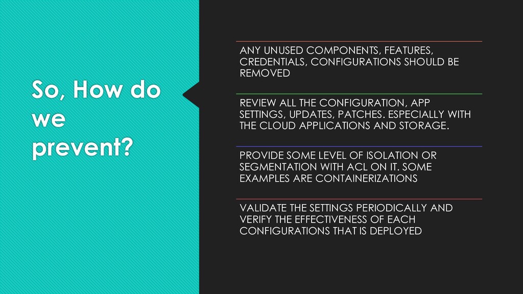 CONFIGURATIONS SHOULD BE REMOVED REVIEW ALL THE CONFIGURATION, APP SETTINGS, UPDATES, PATCHES. ESPECIALLY WITH THE CLOUD APPLICATIONS AND STORAGE. PROVIDE SOME LEVEL OF ISOLATION OR SEGMENTATION WITH ACL ON IT. SOME EXAMPLES ARE CONTAINERIZATIONS VALIDATE THE SETTINGS PERIODICALLY AND VERIFY THE EFFECTIVENESS OF EACH CONFIGURATIONS THAT IS DEPLOYED