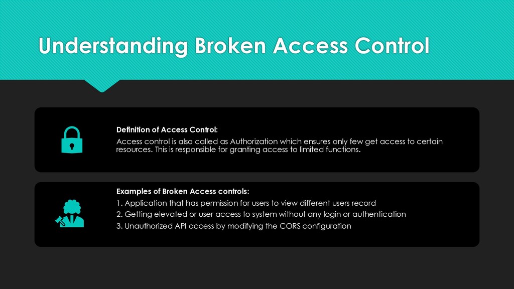 is also called as Authorization which ensures only few get access to certain resources. This is responsible for granting access to limited functions. Examples of Broken Access controls: 1. Application that has permission for users to view different users record 2. Getting elevated or user access to system without any login or authentication 3. Unauthorized API access by modifying the CORS configuration