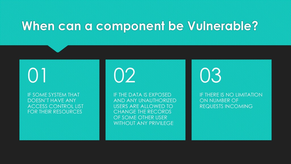 DOESN’T HAVE ANY ACCESS CONTROL LIST FOR THEIR RESOURCES 01 IF THE DATA IS EXPOSED AND ANY UNAUTHORIZED USERS ARE ALLOWED TO CHANGE THE RECORDS OF SOME OTHER USER WITHOUT ANY PRIVILEGE 02 IF THERE IS NO LIMITATION ON NUMBER OF REQUESTS INCOMING 03
