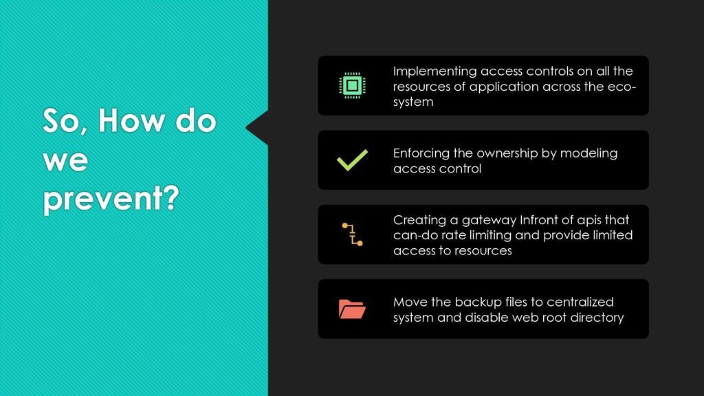 the resources of application across the eco- system Enforcing the ownership by modeling access control Creating a gateway Infront of apis that can-do rate limiting and provide limited access to resources Move the backup files to centralized system and disable web root directory
